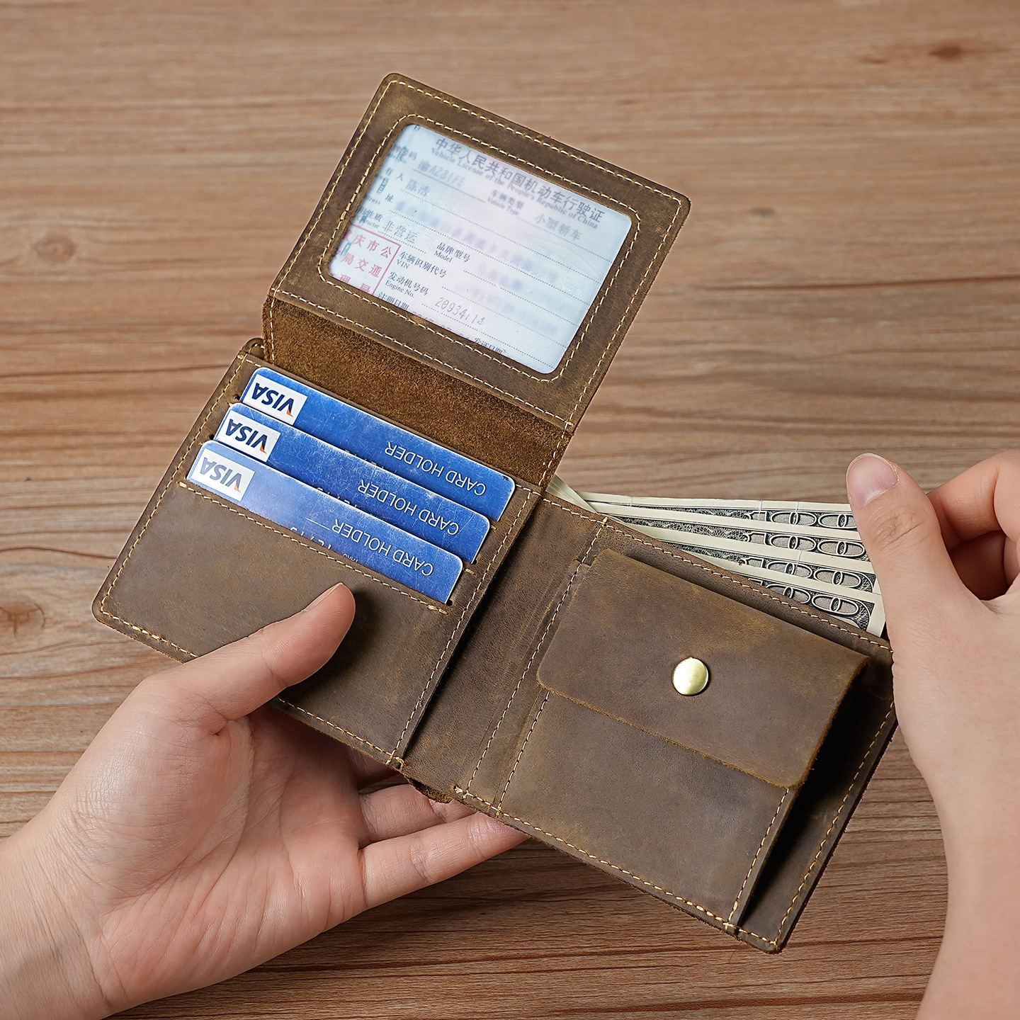 疯马皮男款真皮钱包复古风多功能钱夹含透明窗卡位按扣硬币零钱袋