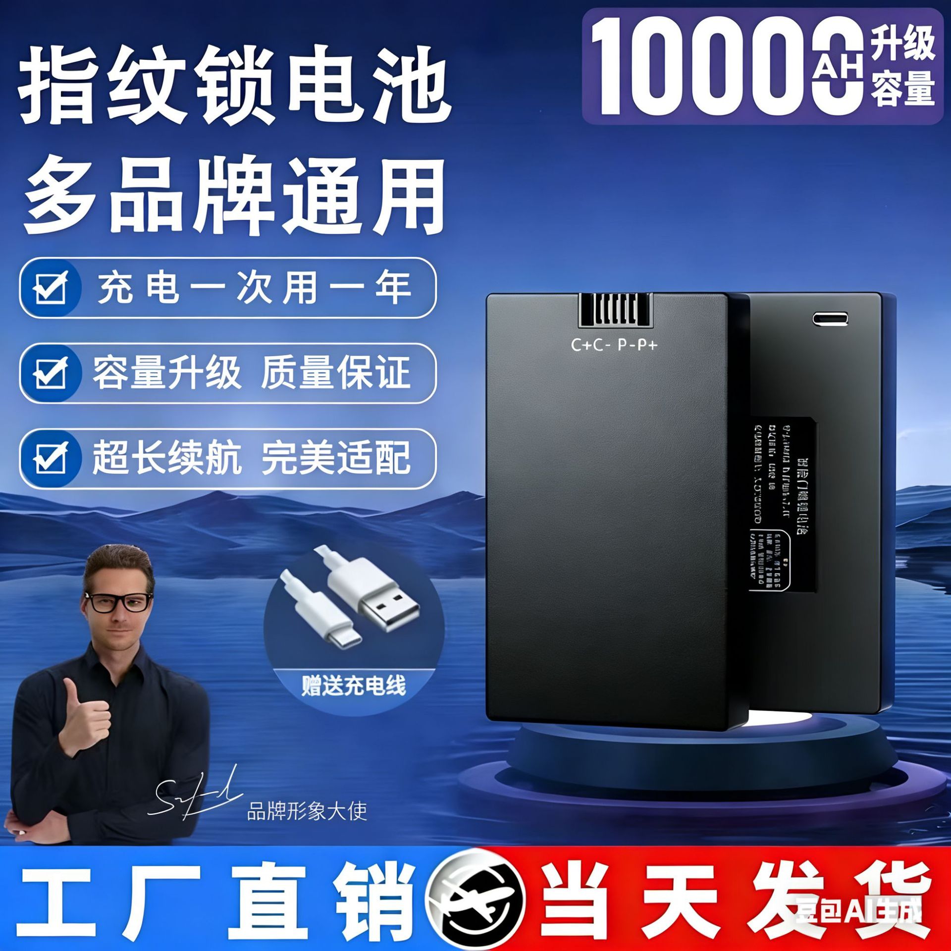 指纹锁锂电池10000mAh通用大容量入口电芯超长续航可充电智能门锁