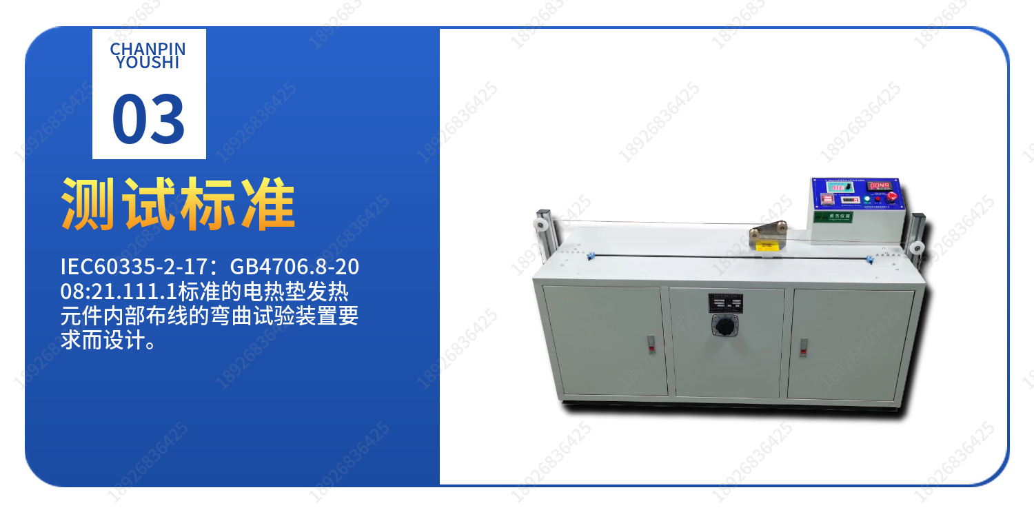 適用範囲 この試験機は、GB4706.8-03「家庭用および類似の電気製品用の安全な電気毛布、電気マット、および類似の柔軟な加熱器具に関する特別要件」に基づいています。