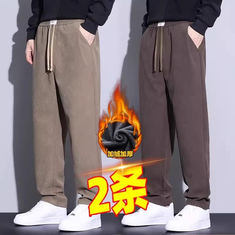 冬季加绒加厚保暖松紧腰男士百搭大码宽松休闲裤新束脚长裤直筒裤