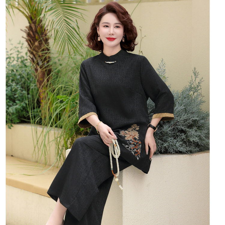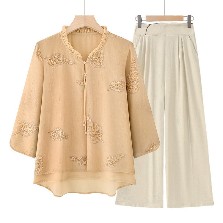 2025年中高年向け新作おしゃれママトップス、夏ママ半袖スーツ、気質義母ゆったり2点セット