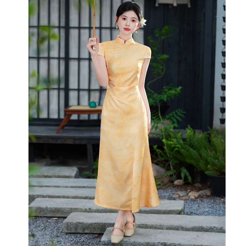 ママの夏のチャイナドレス 2025 新しい中高年女性の夏の新しい中国風スリム半袖ロングスカート