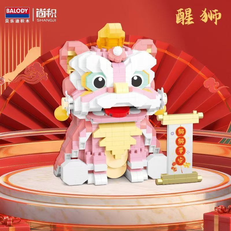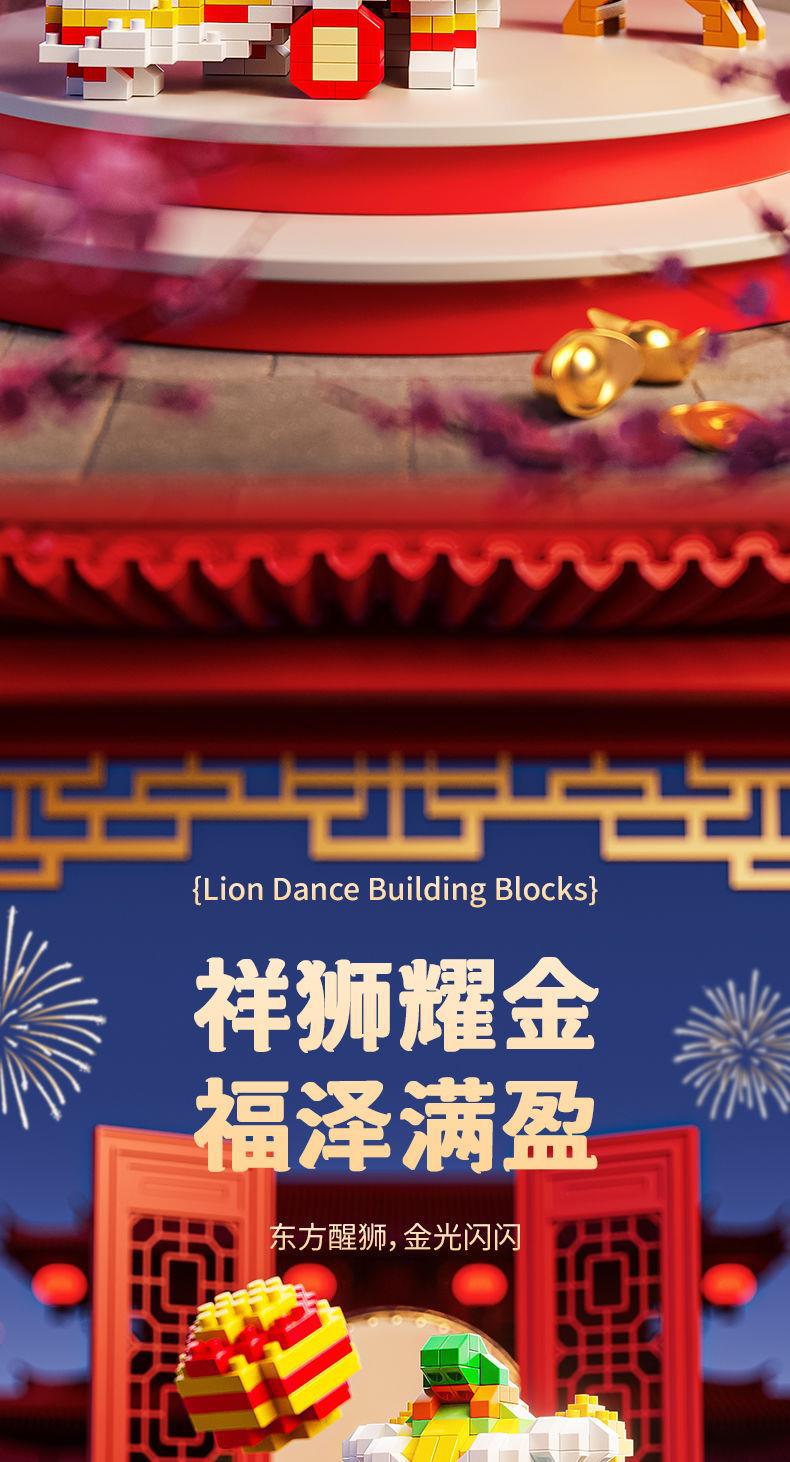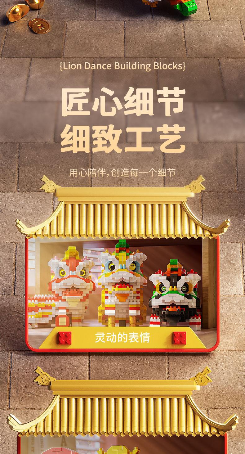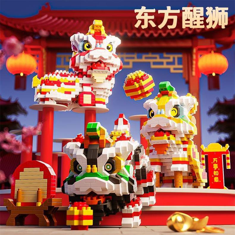 国潮醒狮积木拼装玩具微颗粒新年礼物摆件儿童益智拼图创意礼品