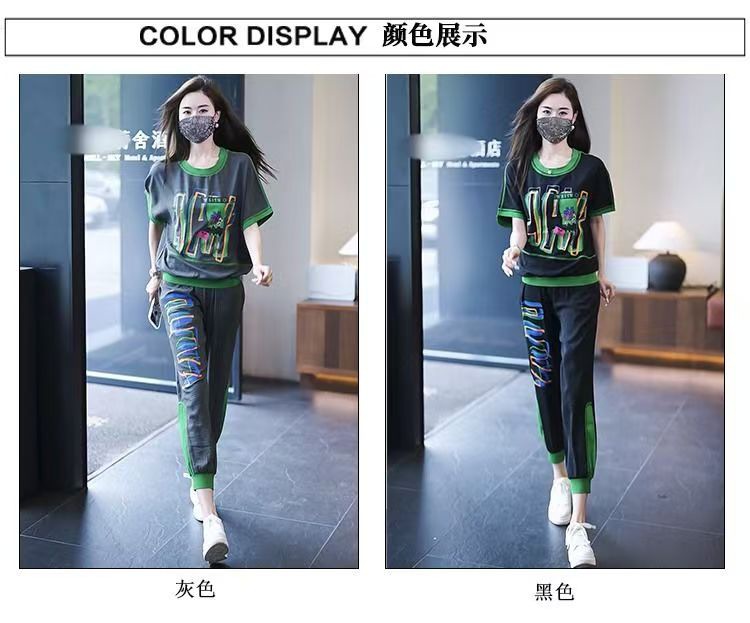 女性用のトレンディなカジュアルスポーツスーツ、ゆったりとした大きいサイズの女性用痩身夏服、新しい半袖女性用クロップドパンツ2点セット