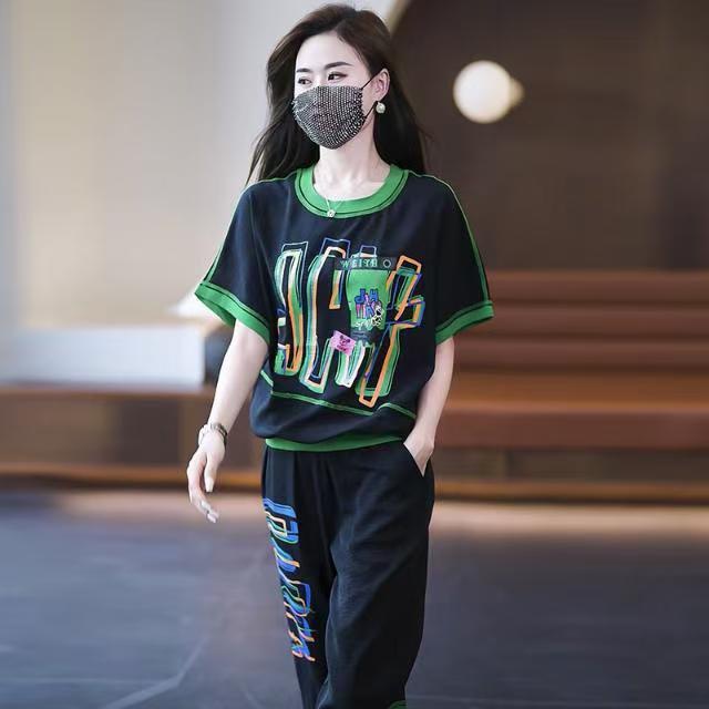 2025 プラスサイズの女性のファットシスター 100kg 夏の新しいルーズカバー半袖クロップドパンツ 2 点セット