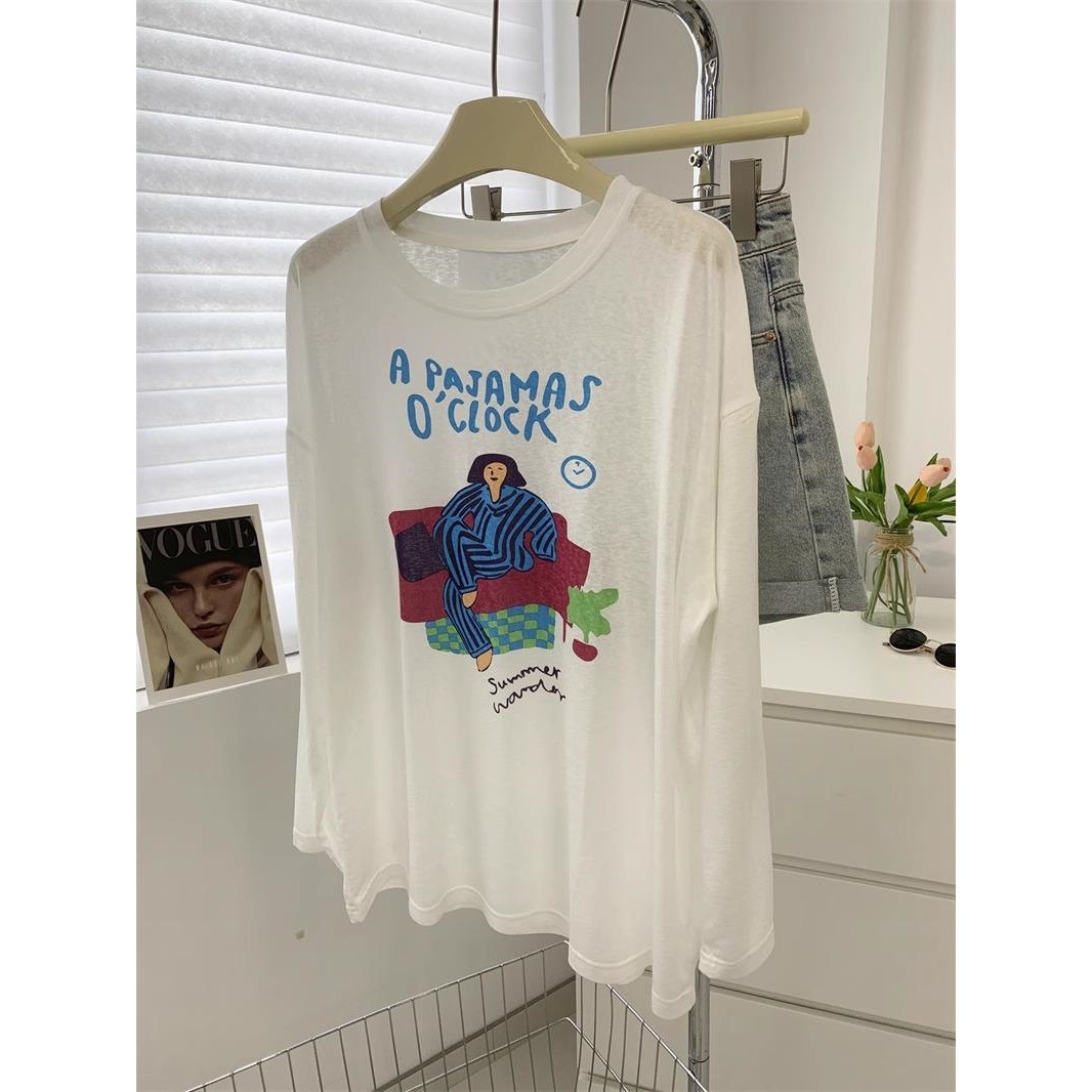 女性のための白いルーズプリント年齢軽減日焼け止め Tシャツ 2025 夏の新しいラウンドネック長袖レイジーデザイントップ