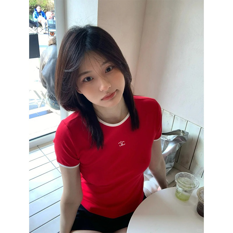 コットンレッドショルダー半袖Tシャツレディース夏スリムフィットスイートホットガールショートトップ