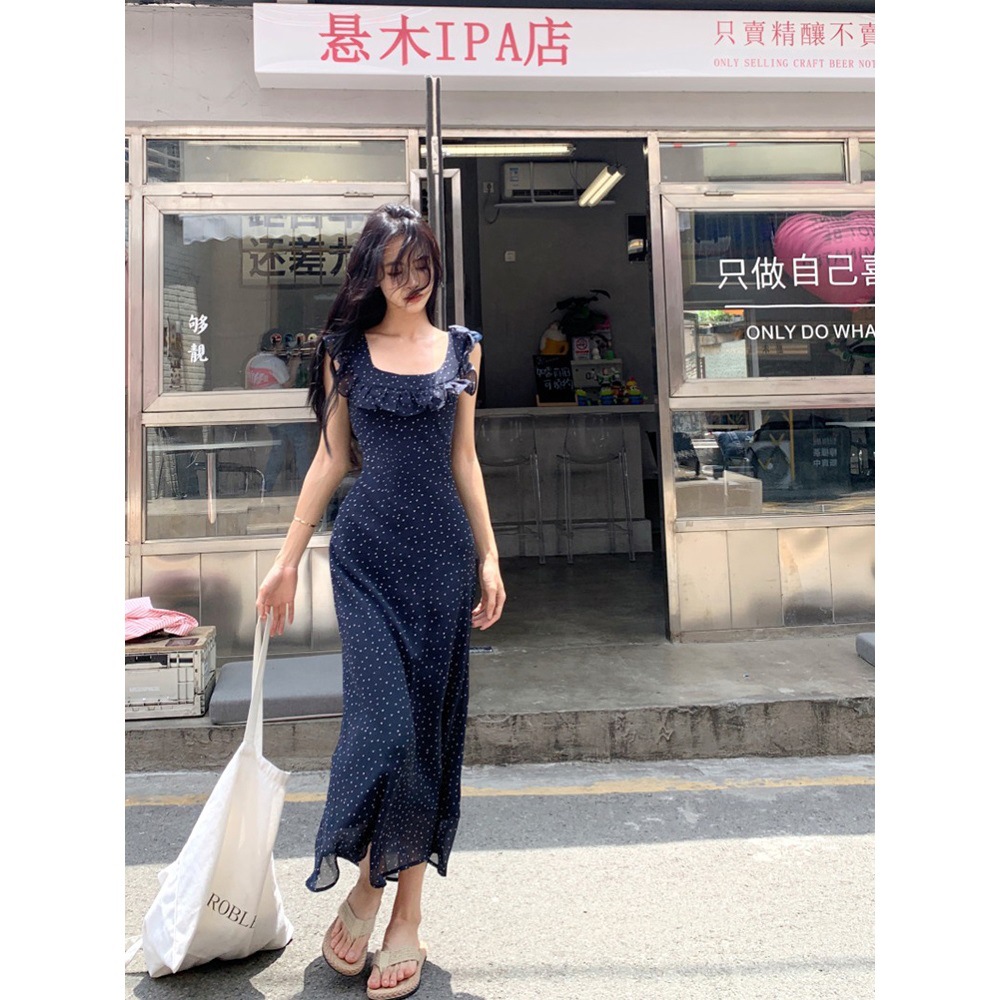 フレンチフローラル水玉フライングスリーブスクエアカラーサスペンダードレス女性のための 2025 新しい夏のウエストロングスカート