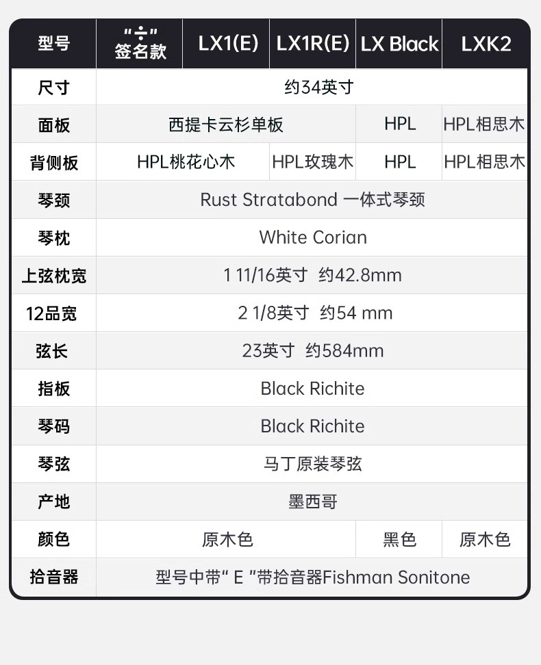 LX1 ウッドカラーベニヤアコースティック、LX1E ウッドカラーエレクトリックボックス、LX1R ベニヤアコースティック (ローズウッド HPL 背面と側面)、LX1RE ベニヤエレクトリック