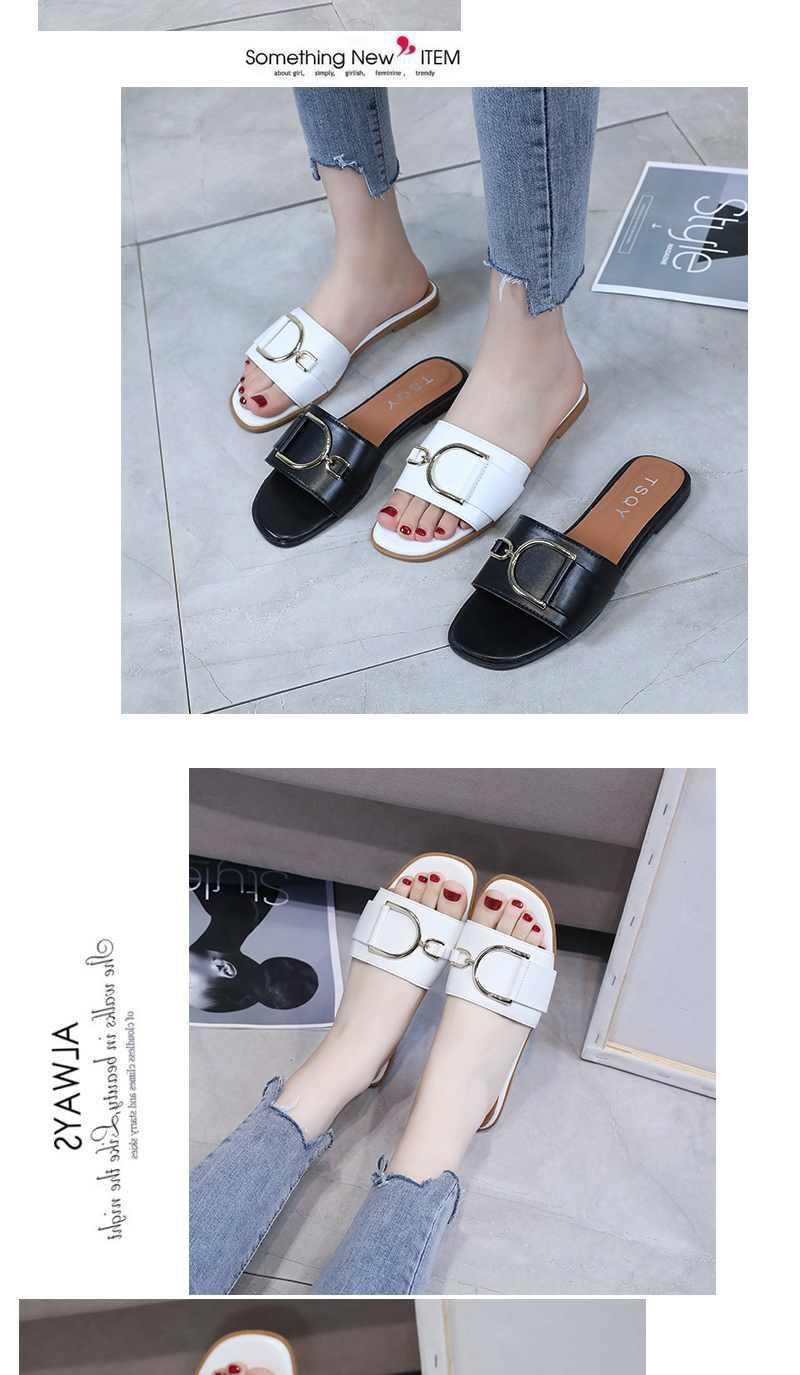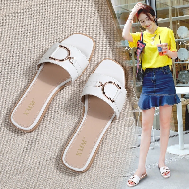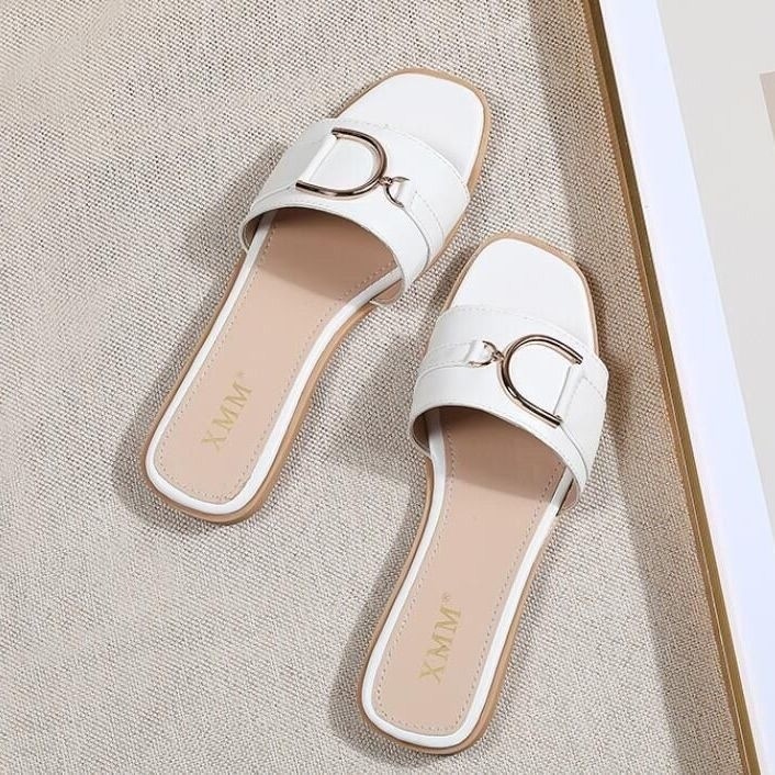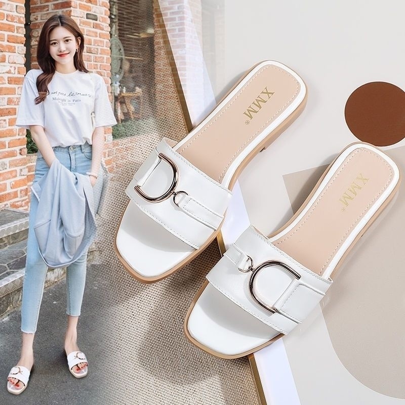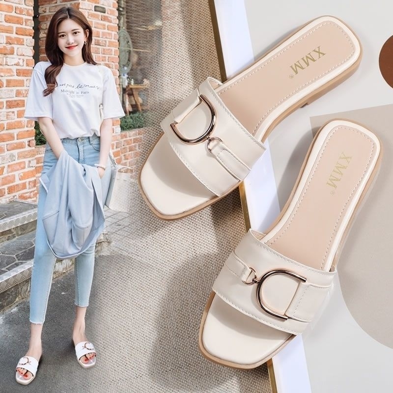 クロスボーダーレディースシューズレディース新しいファッションスリッパクラシックな気質多用途ソリッドカラーメタル装飾スクエアトゥフラットサンダル