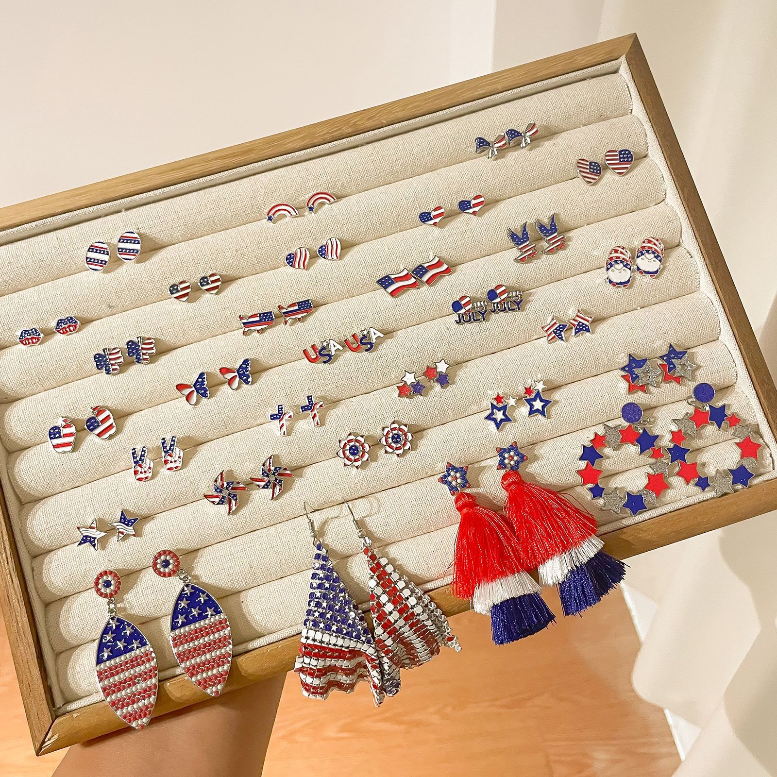 欧米国境を越えたアメリカ独立日国旗帽スリッパ愛イヤリング赤白青縞国旗耳飾り卸売り