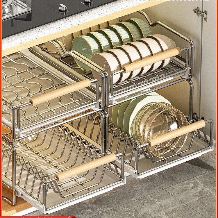 ステンレス製食器収納ラック キッチンキャビネット内蔵ラック 引き出し式バスケット 引き出し式ボウルとプレート水切りラック