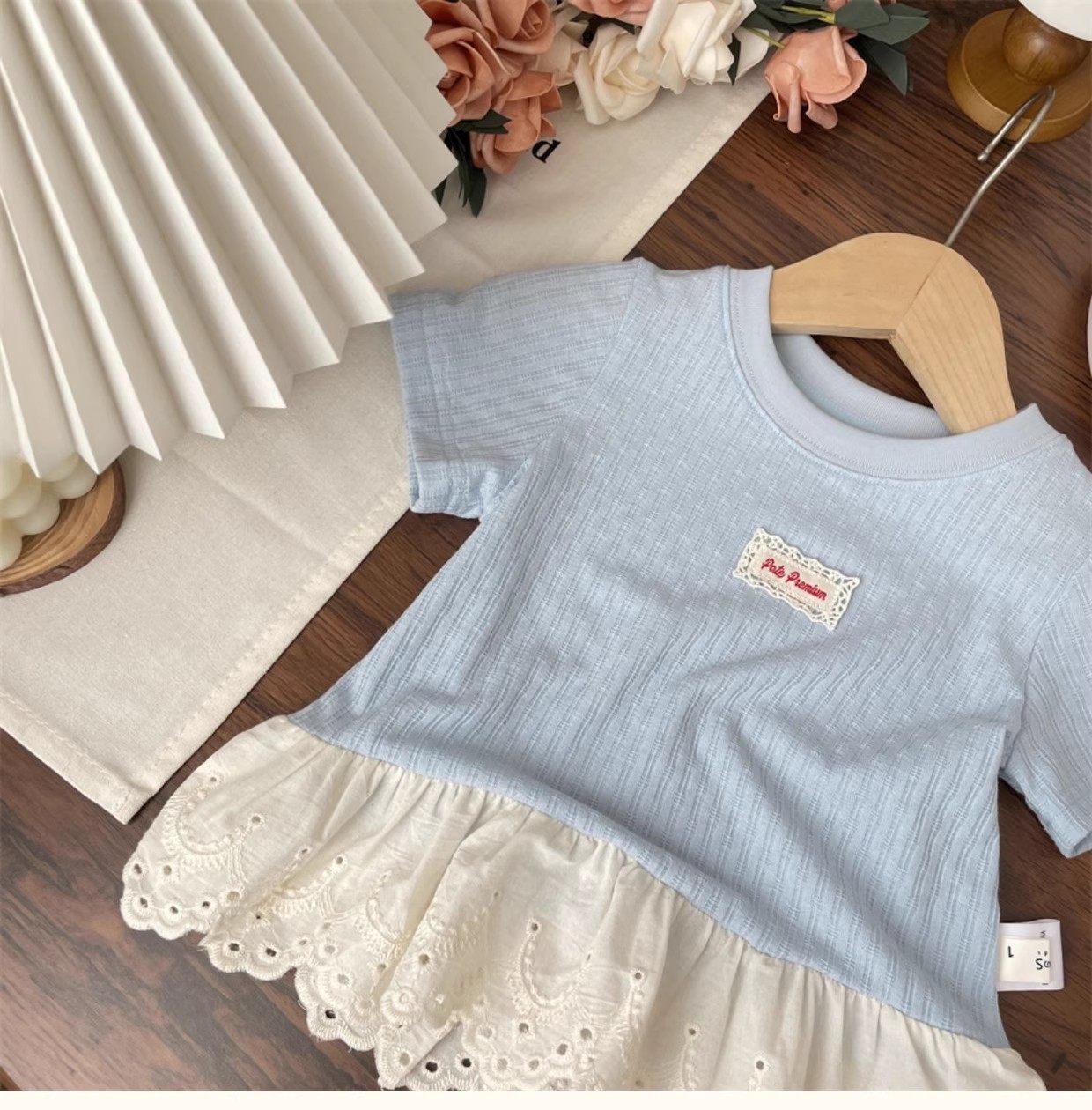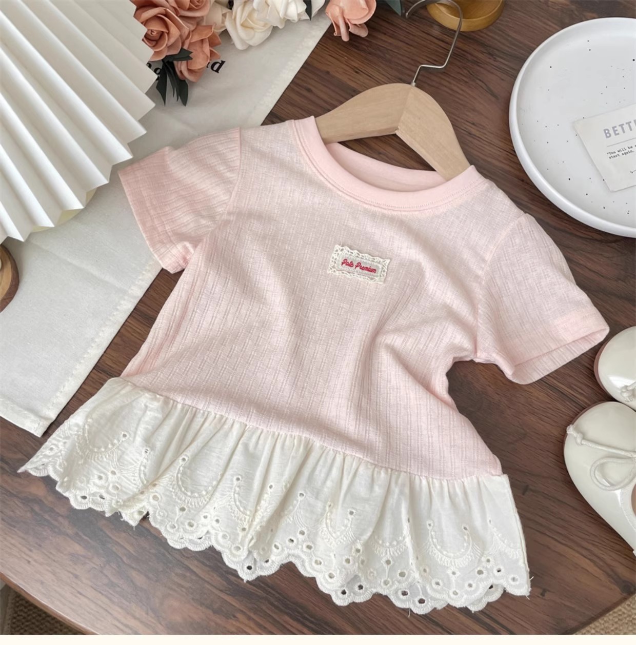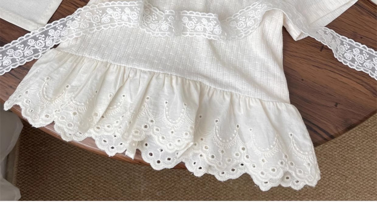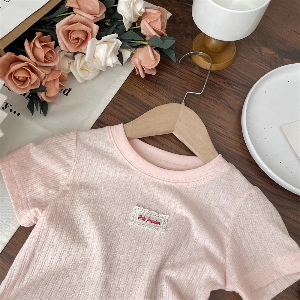 女の子 Tシャツ夏服 2025 夏新パッチレース半袖 Tシャツスカートトップボトムシャツ子供服