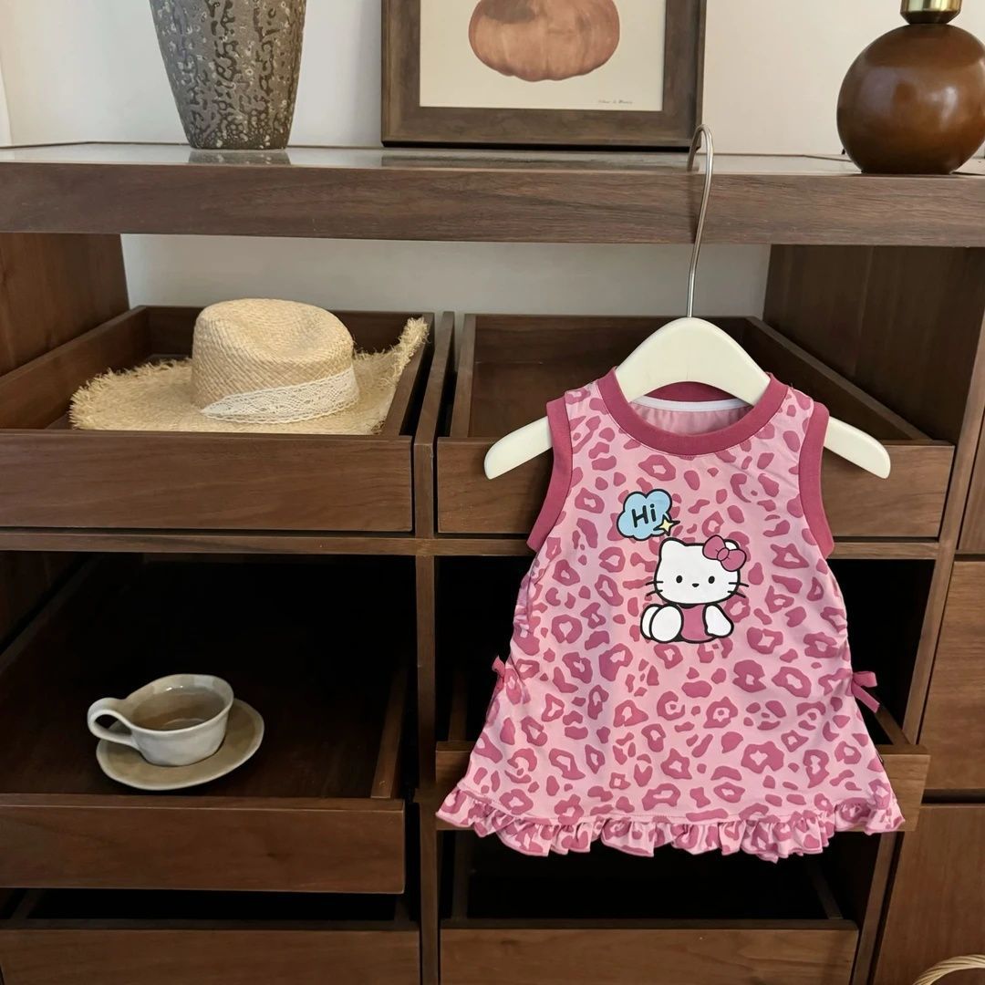 女の子ドレスサンドレス夏の新しい女の赤ちゃんかわいいピンクヒョウ柄甘くてクールなレースのリボン子供ドレス