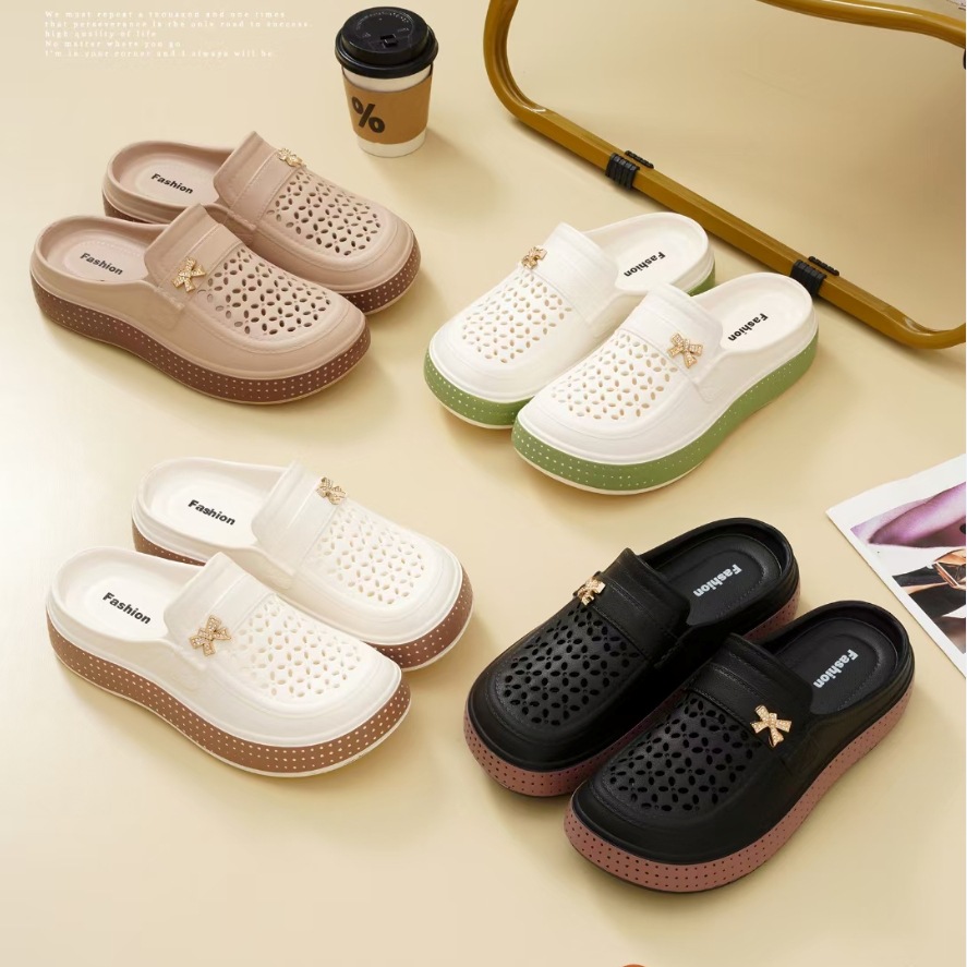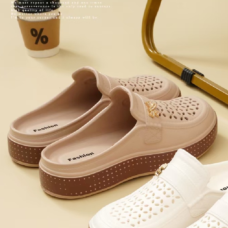 女性用夏用通気性厚底シューズ、外履き用包頭スリッパ、無地浅口身長アップシューズ、シンプルなソフトソールハーフスリッパ