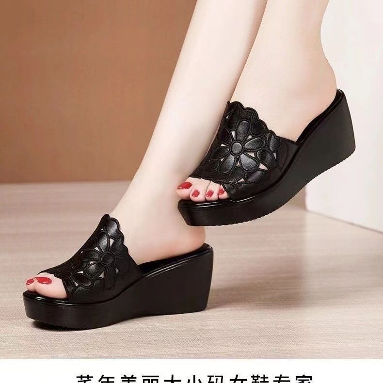 女性のハイヒールのスリッパの夏の外は厚い底のファッションの家庭の滑り止めのお母さんの靴の柔らかい底の社会の坂と冷たいスリッパを着ます。