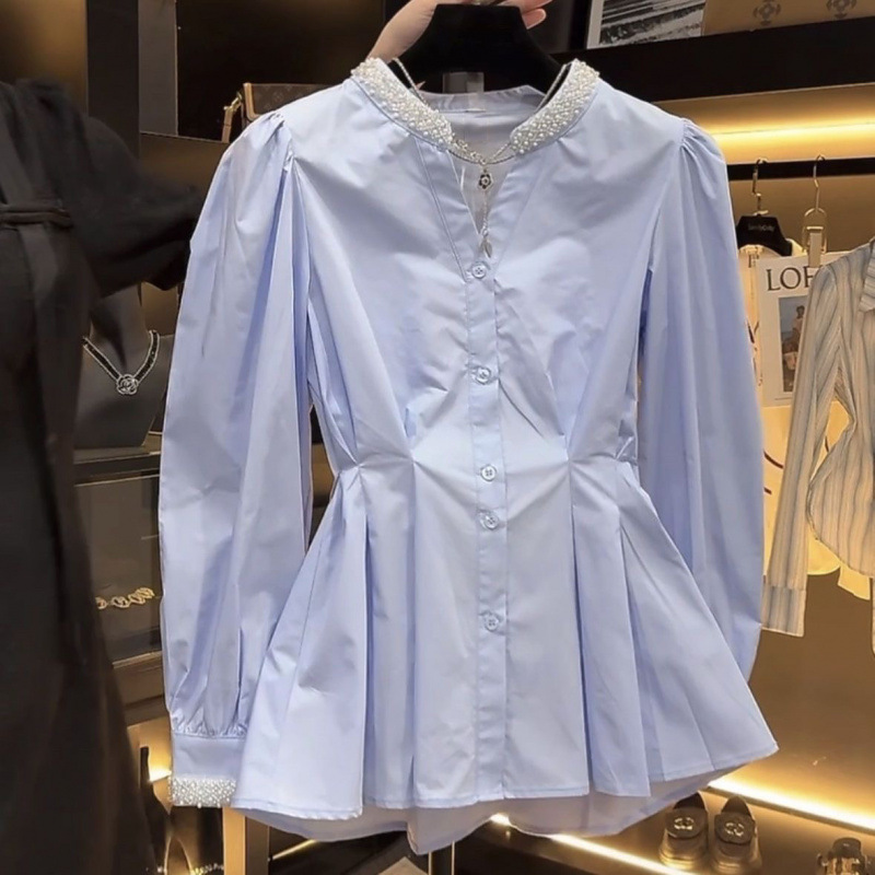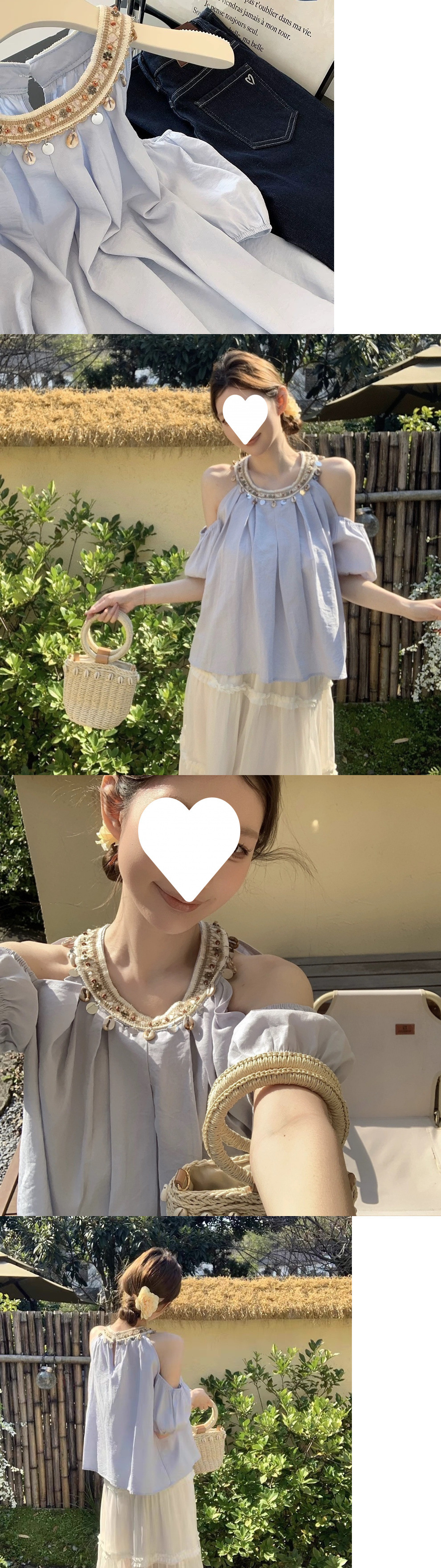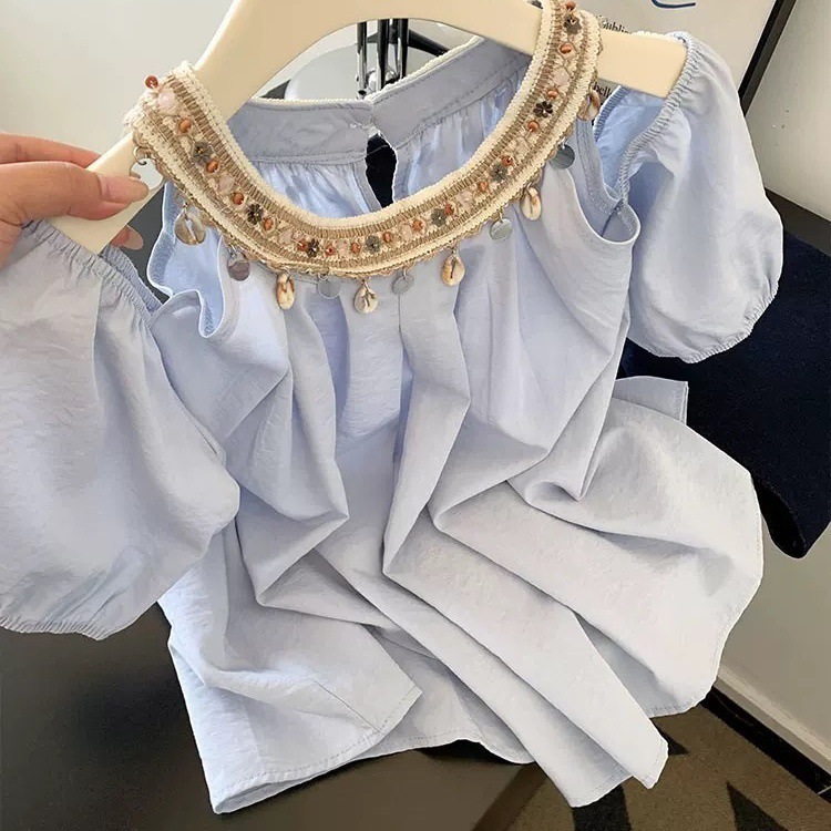 韓国海辺リゾートスタイルブルー女性の25新しいハイエンドヘビービーズラウンドネックオフショルダートップ