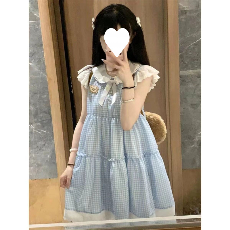 日本のソフトガールデザインクマ刺繍デザイン小さなフライングスリーブドレスかわいい夏甘い年齢軽減ドレス