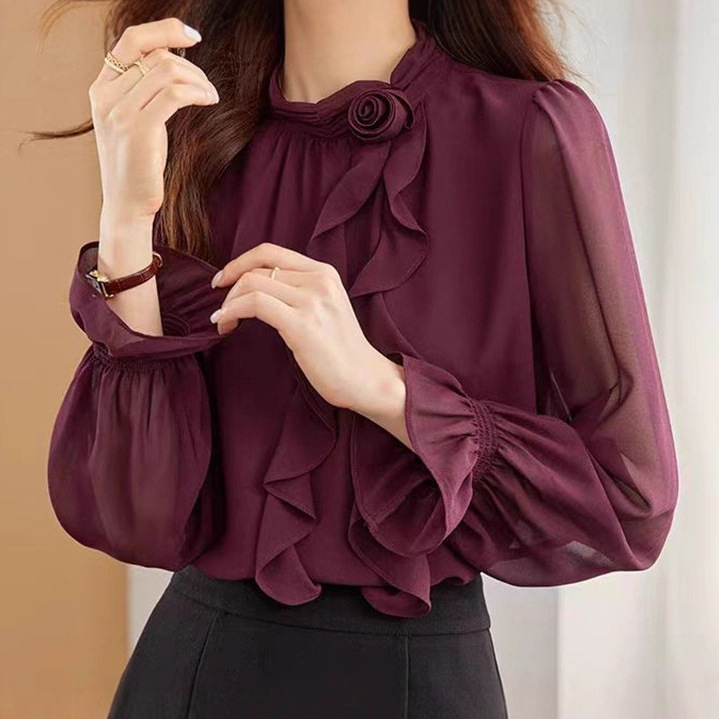 リッチウーマントップス、ファッショナブルでエレガント、新しい立体フラワー2025、長袖、スタンドカラー、西洋スタイル、フレンチスタイル、スリム