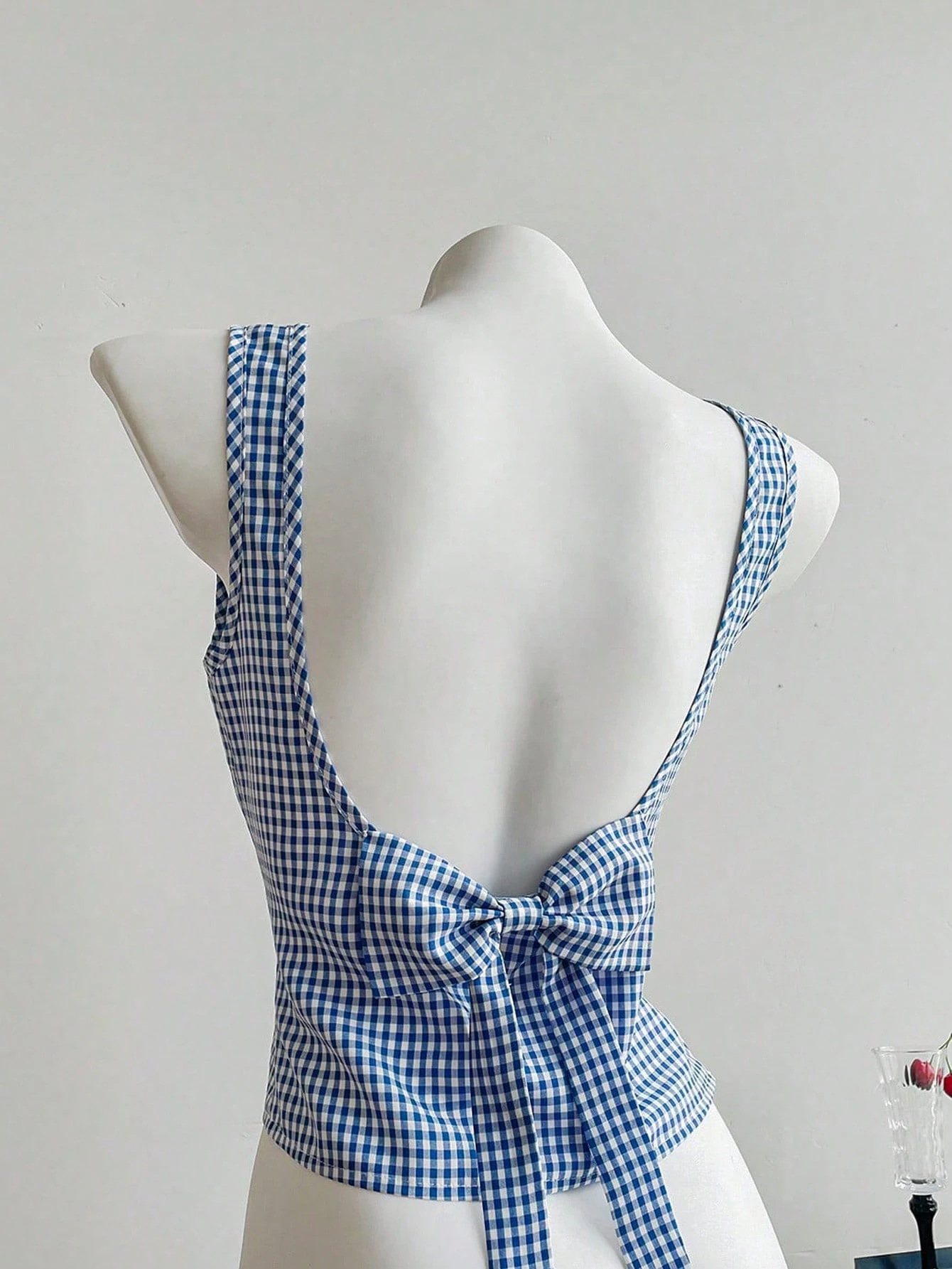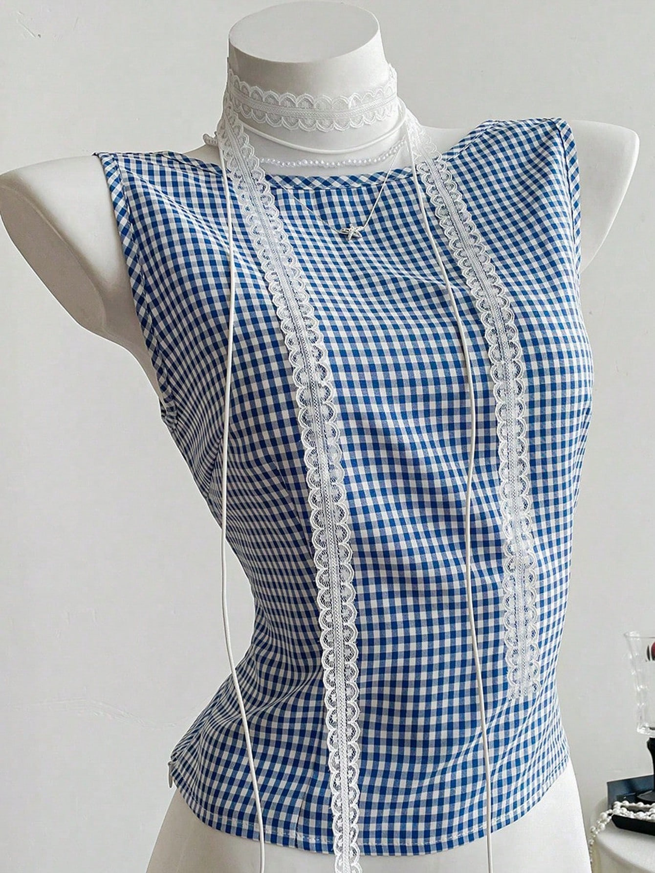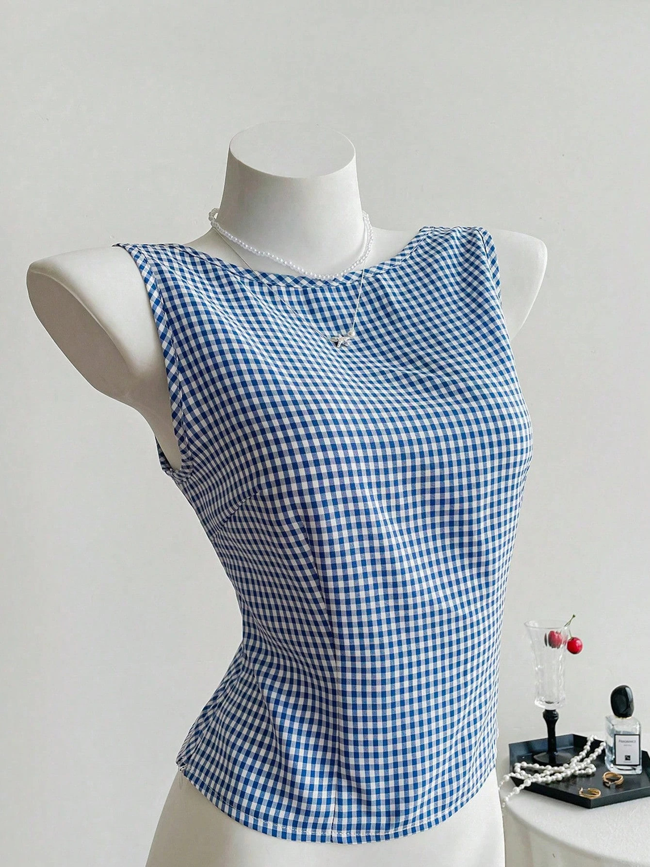 チェック柄ベスト女性 2025 新しい夏のインナーブルーボトムホットガールフレンチシンプルシックなノースリーブトップ