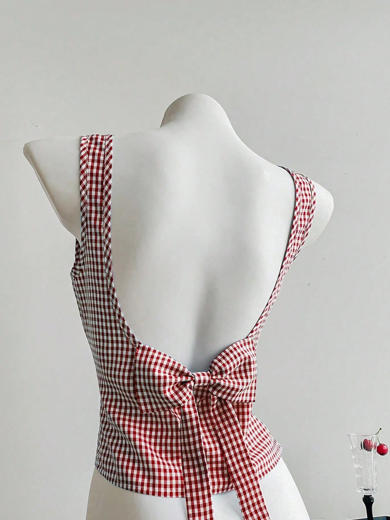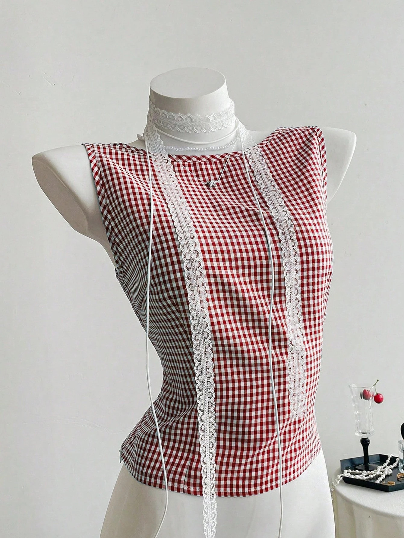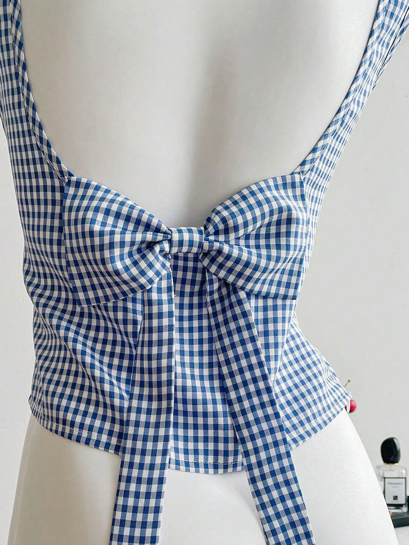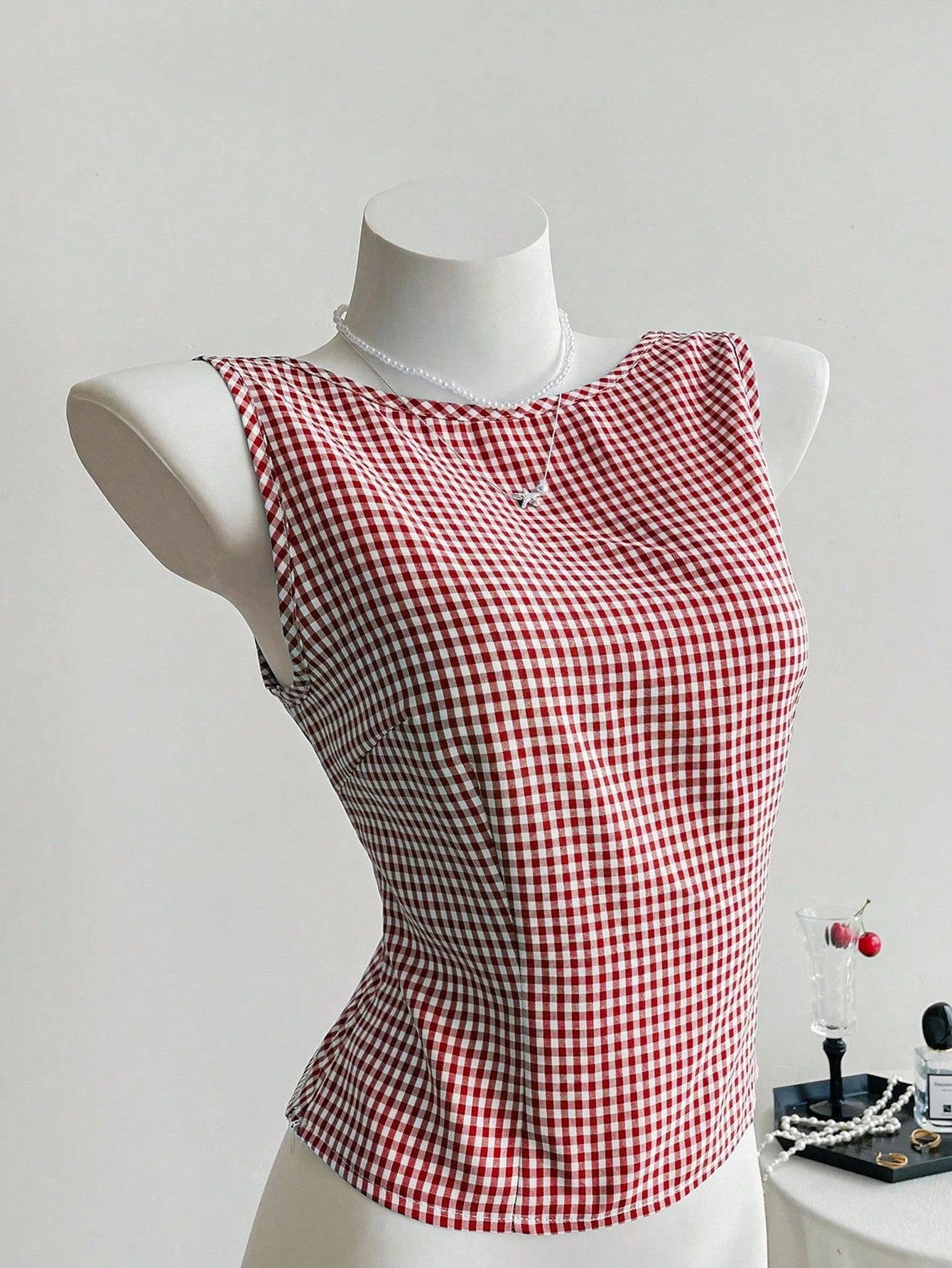 チェック柄ベスト女性 2025 新しい夏のインナーブルーボトムホットガールフレンチシンプルシックなノースリーブトップ