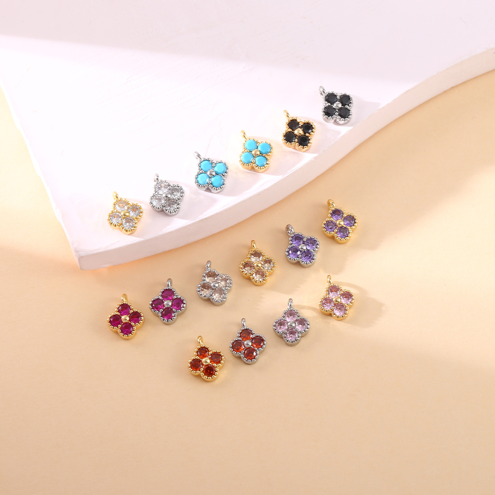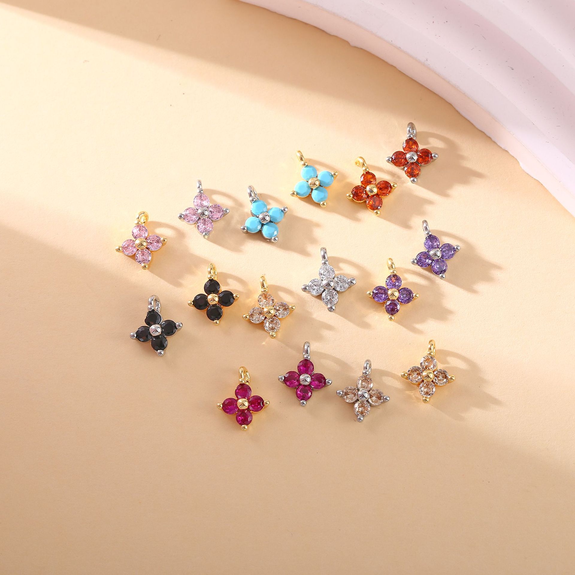 DIYアクセサリー銅メッキ18k真金カラーはジルコン四葉花のペンダントを入れてブレスレットのイヤリングの材料を作ります。