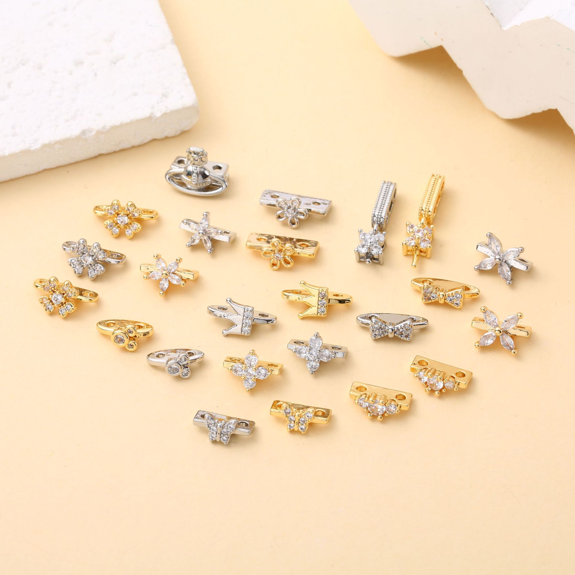 保色18K真金蝴蝶结四叶草双孔排扣双孔隔珠微镶锆石DIY饰品配件