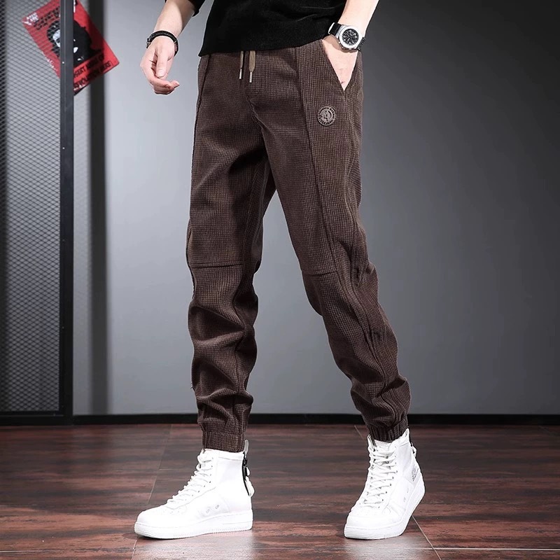秋冬の新型のベルベットのストライプの小さい足のカジュアルなズボンの男性のファッションのゆったりしているコンビネーションのコーデュロイの保温の衛のズボン