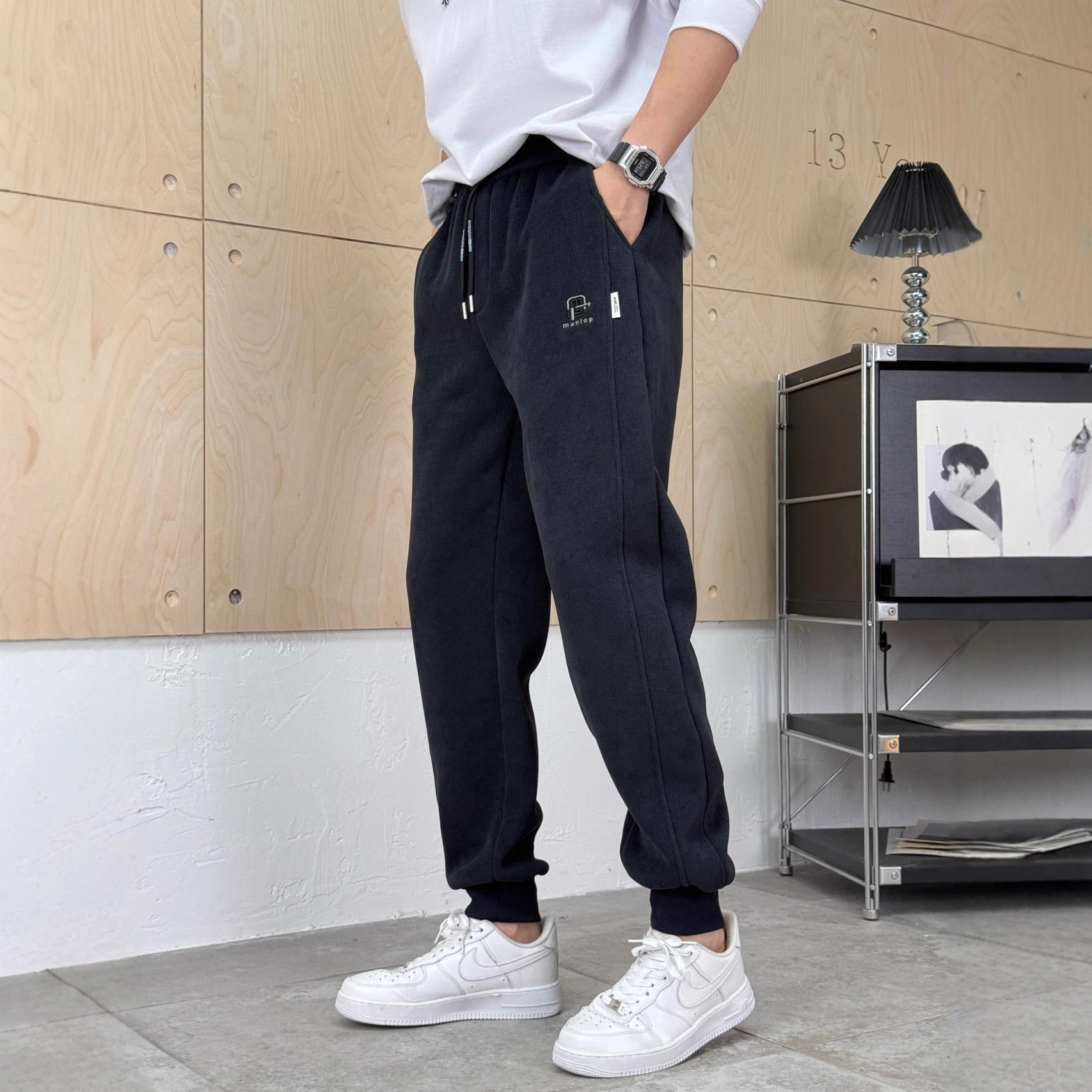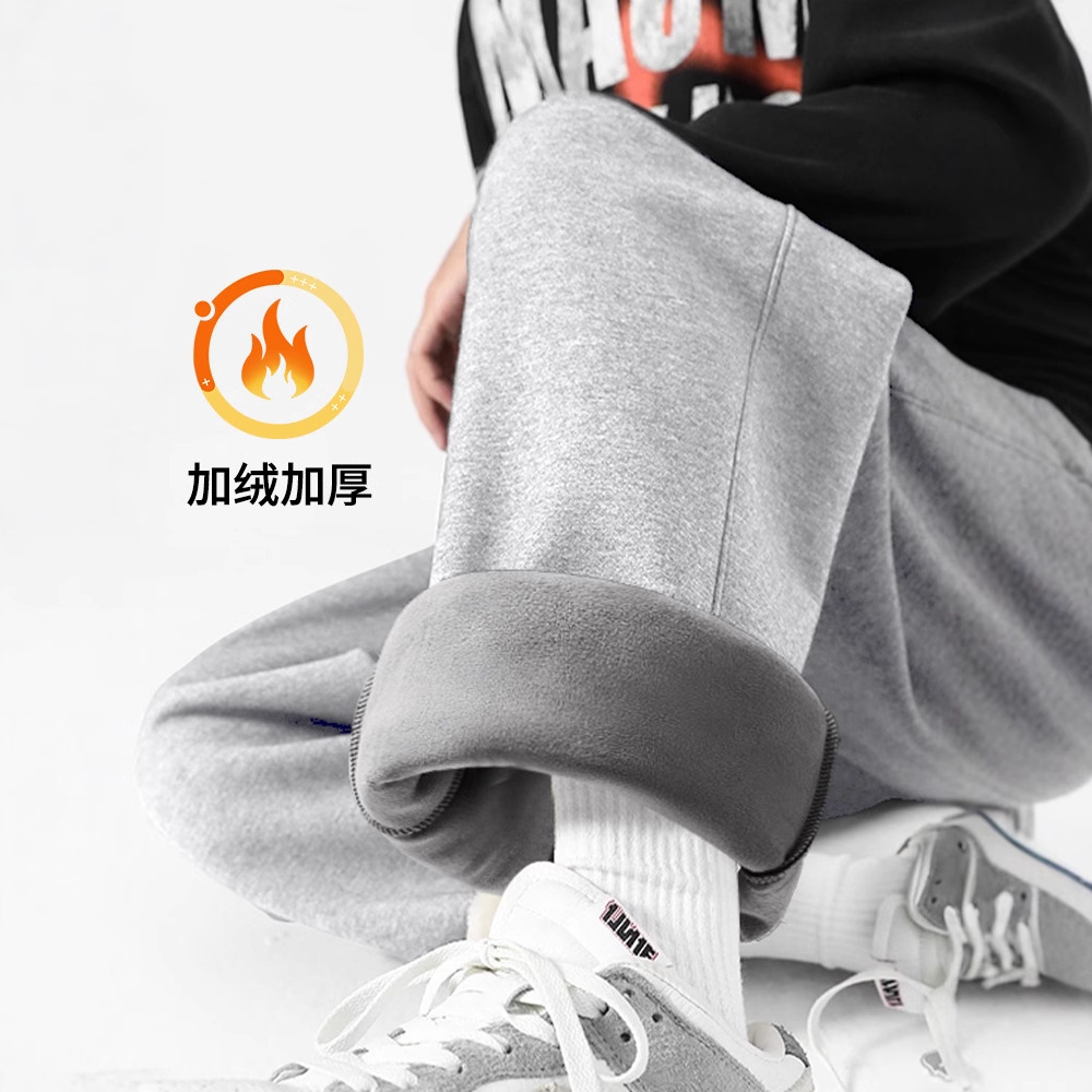 秋冬の男性用グラフェンプラスベルベットパンツ、新しいスタイルのラムベルベットプラスベルベット厚手のロングパンツ、トレンディなルーズスウェットパンツ、多用途