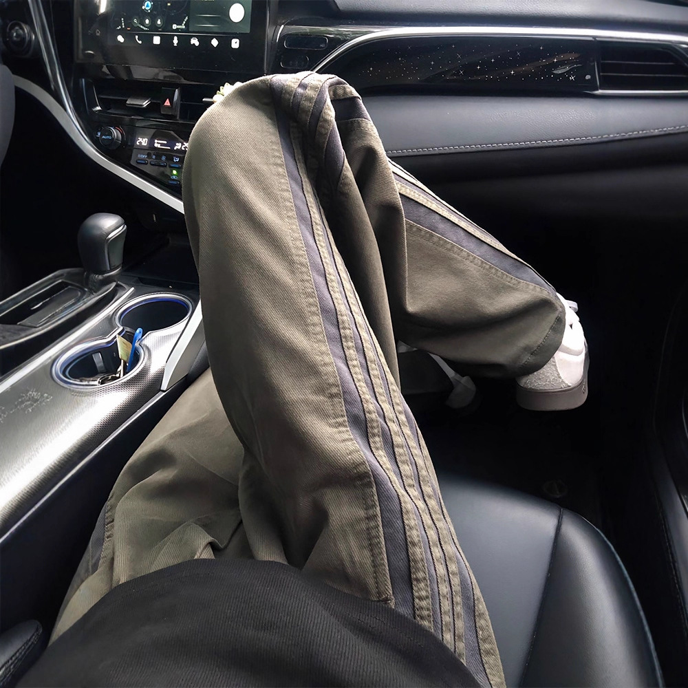 军绿色美式条纹裤子男款秋冬季加绒直筒工装裤垂感宽松运动休闲裤