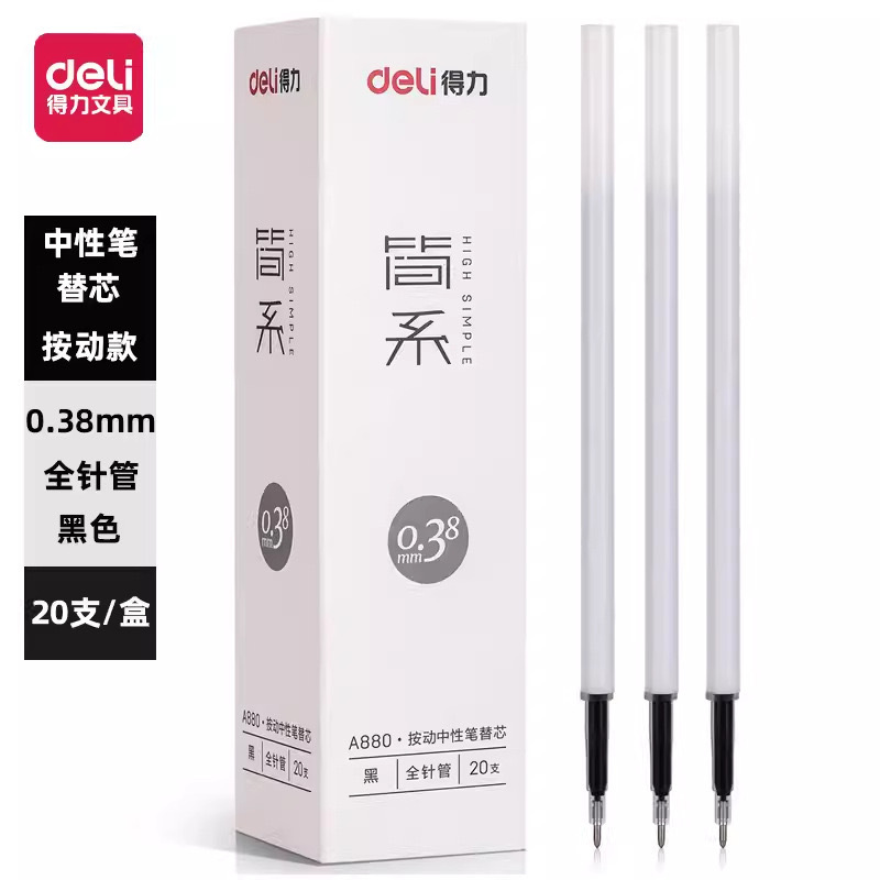 得力学生按动中性笔芯0.38mm水笔替芯白色杆全针管弹簧笔替换黑色