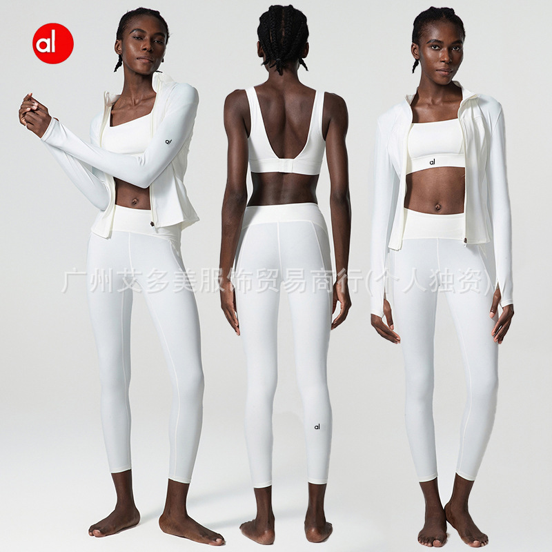 alo跨境瑜伽三件套拼螺纹无缝修身罩衫显瘦长裤yoga固定杯文胸