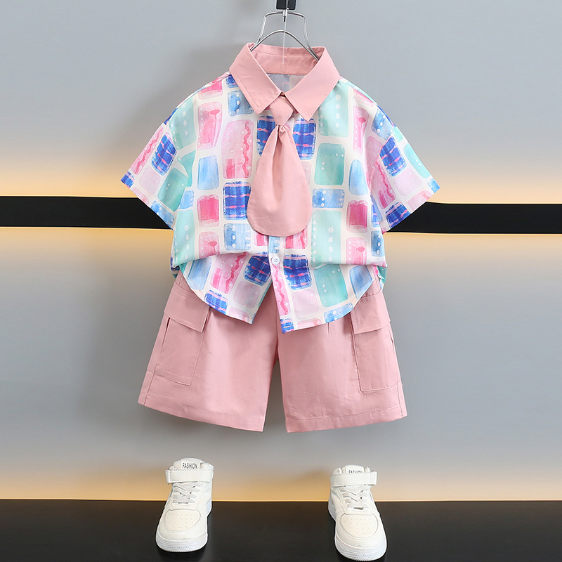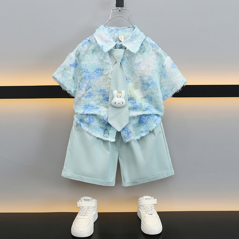 男の子サマースーツ韓国風ハンサムベビーサマー半袖花柄シャツネクタイカレッジスタイル子供服おしゃれ
