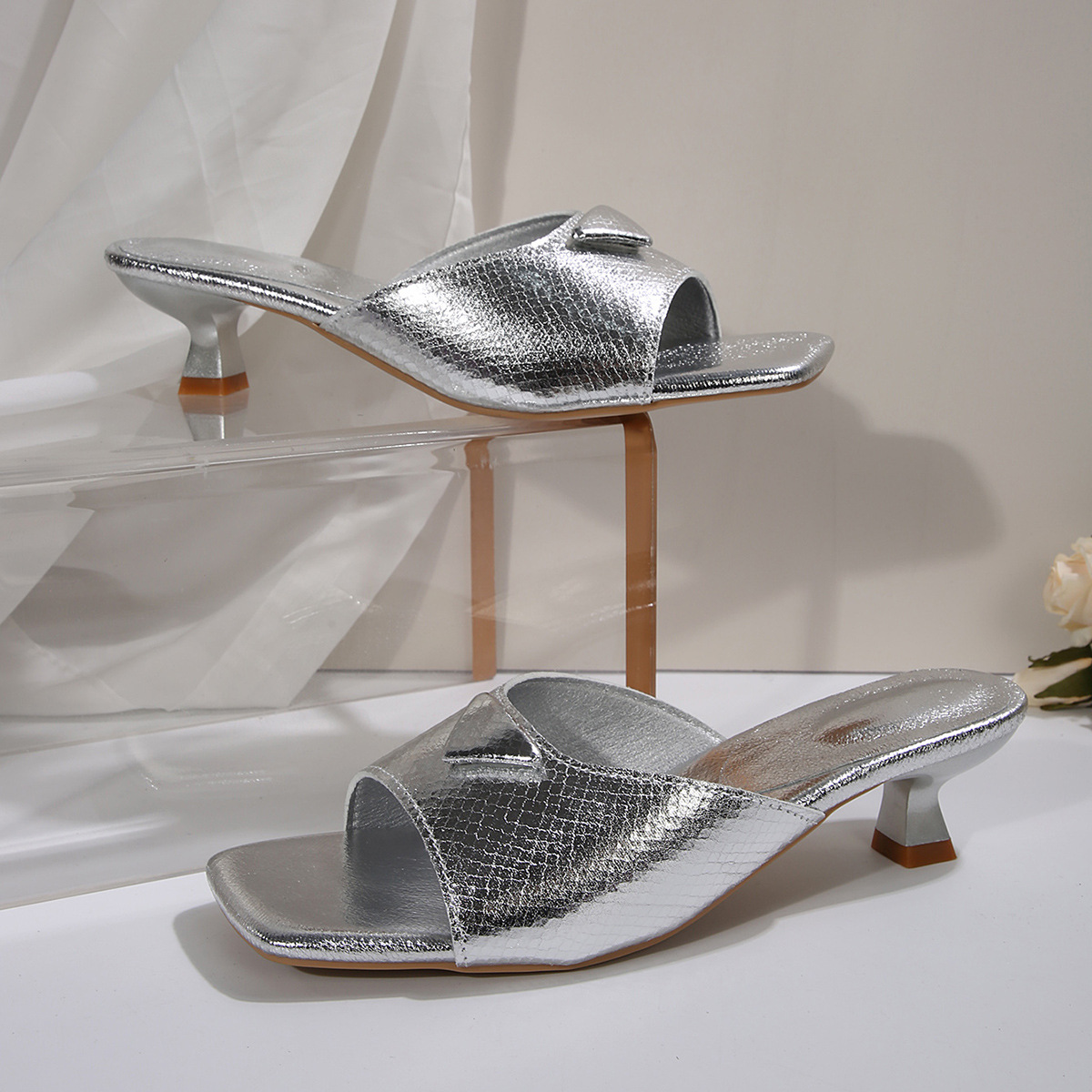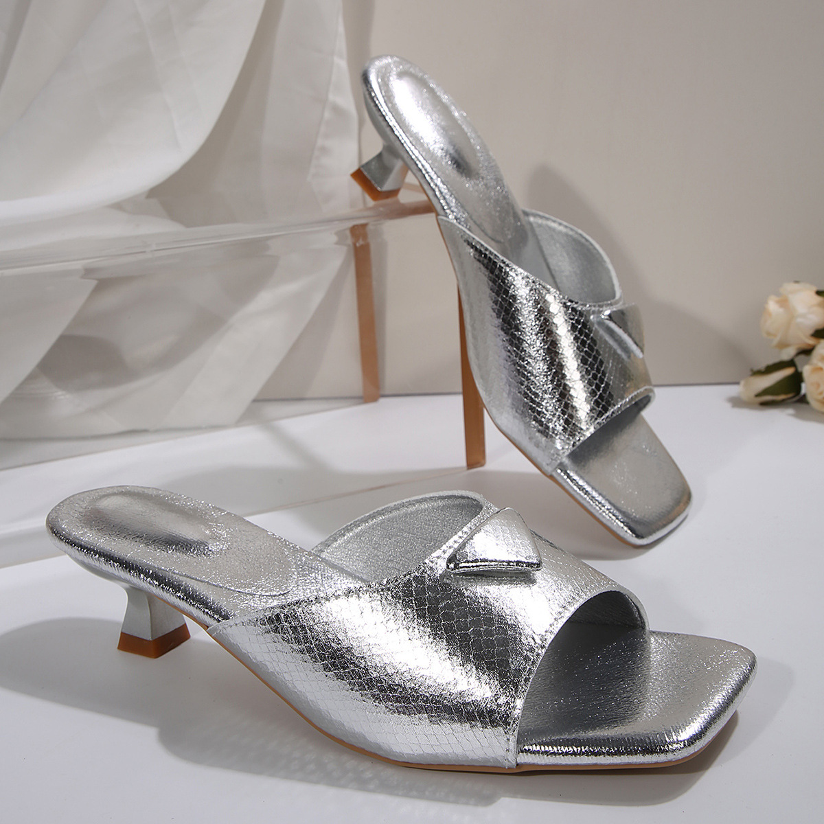 国境を越えた貿易婦人靴 2025 夏の新スタイルシルバースクエアトゥ多用途気質スティレットヒール気質ファッショナブルなローヒールサンダル