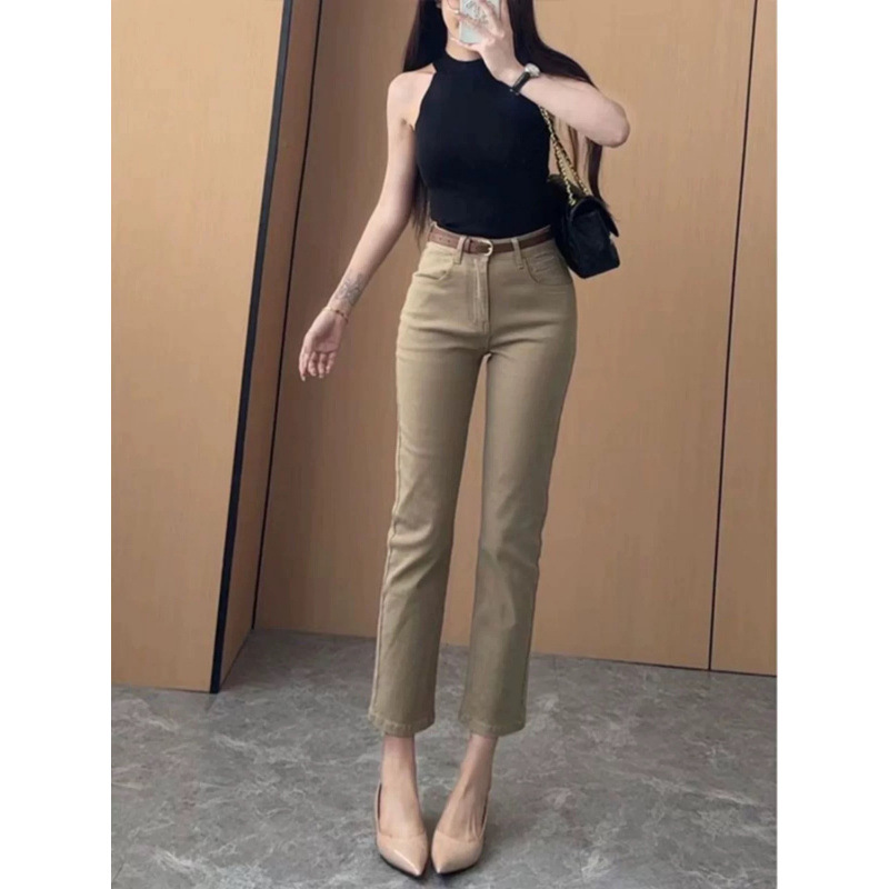 オールドマネースタイル カーキ 9点ストレートジーンズ レディース 春夏 ハイウエスト ストレッチ カジュアル シガレットパンツ 小柄