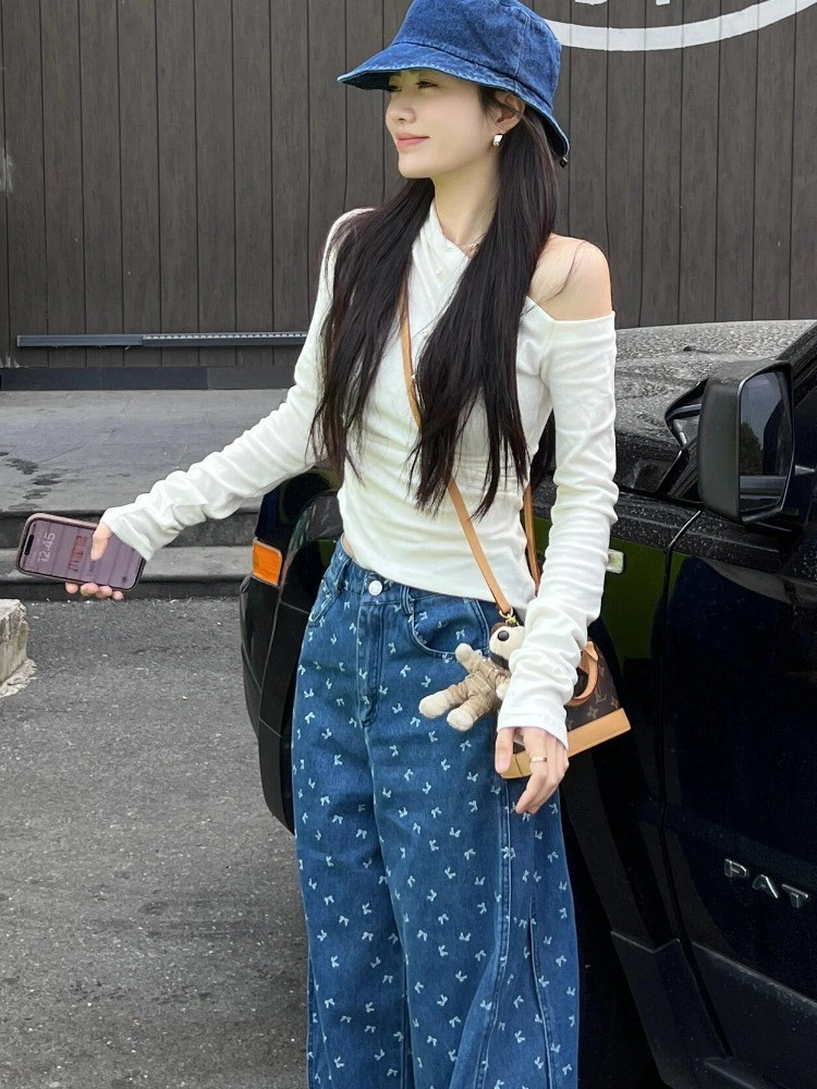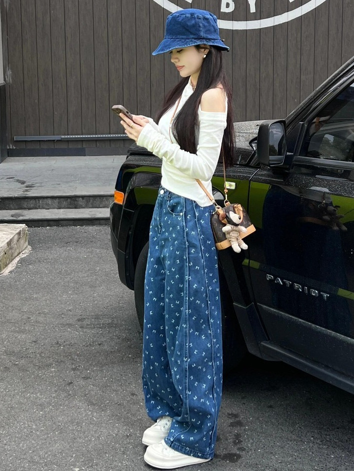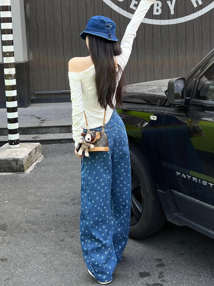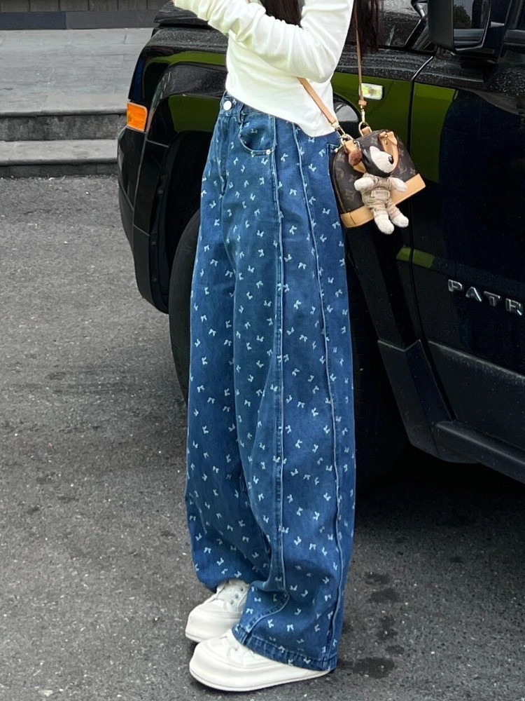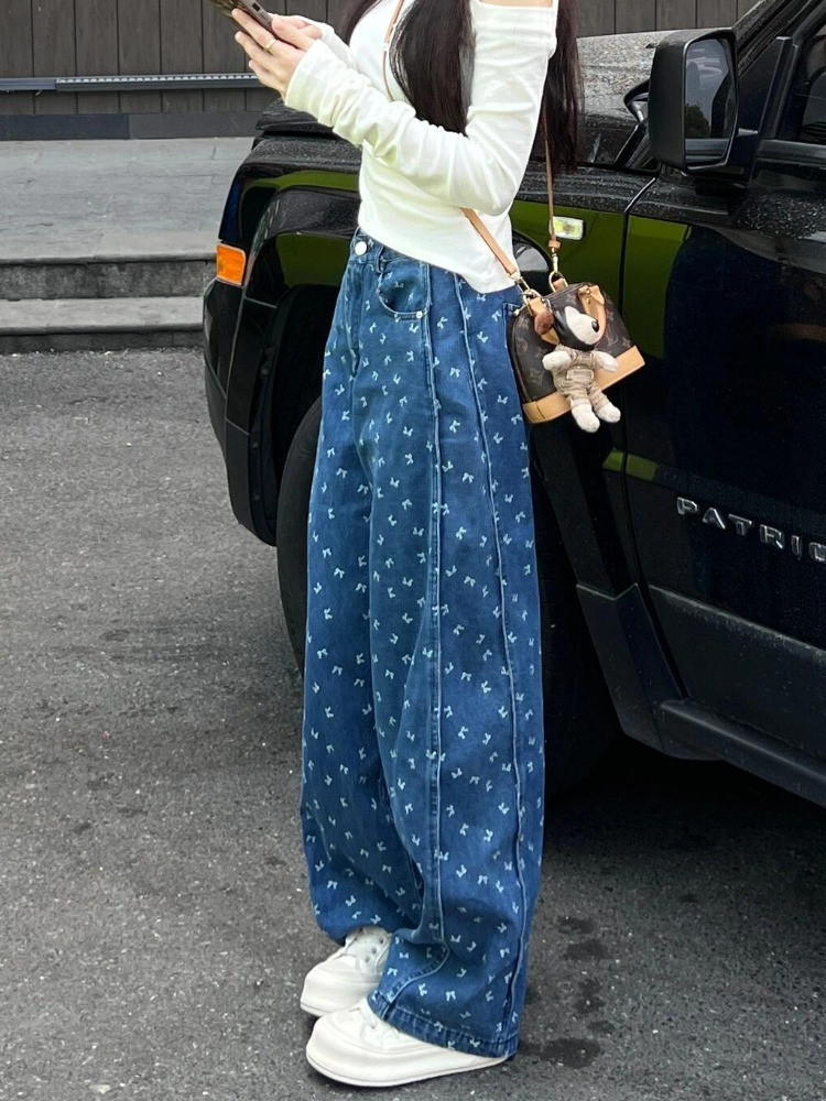 春夏の女性用ブループリントワイドレッグジーンズ、新しいルーズレイジースタイルデザイン、ドレープルーズパンツ