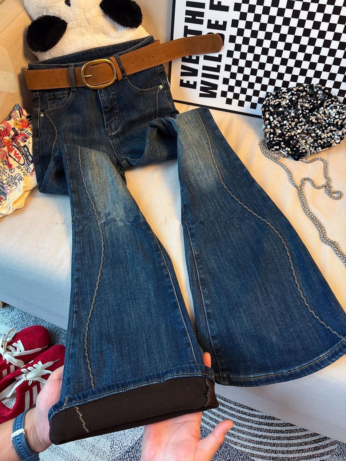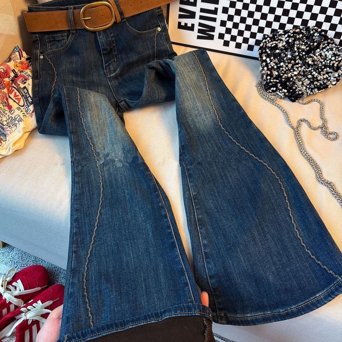 美式紧身微喇裤女25秋冬加绒喇叭牛仔裤新款搭配高跟鞋裤子马蹄裤