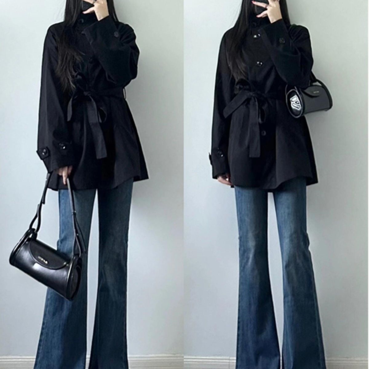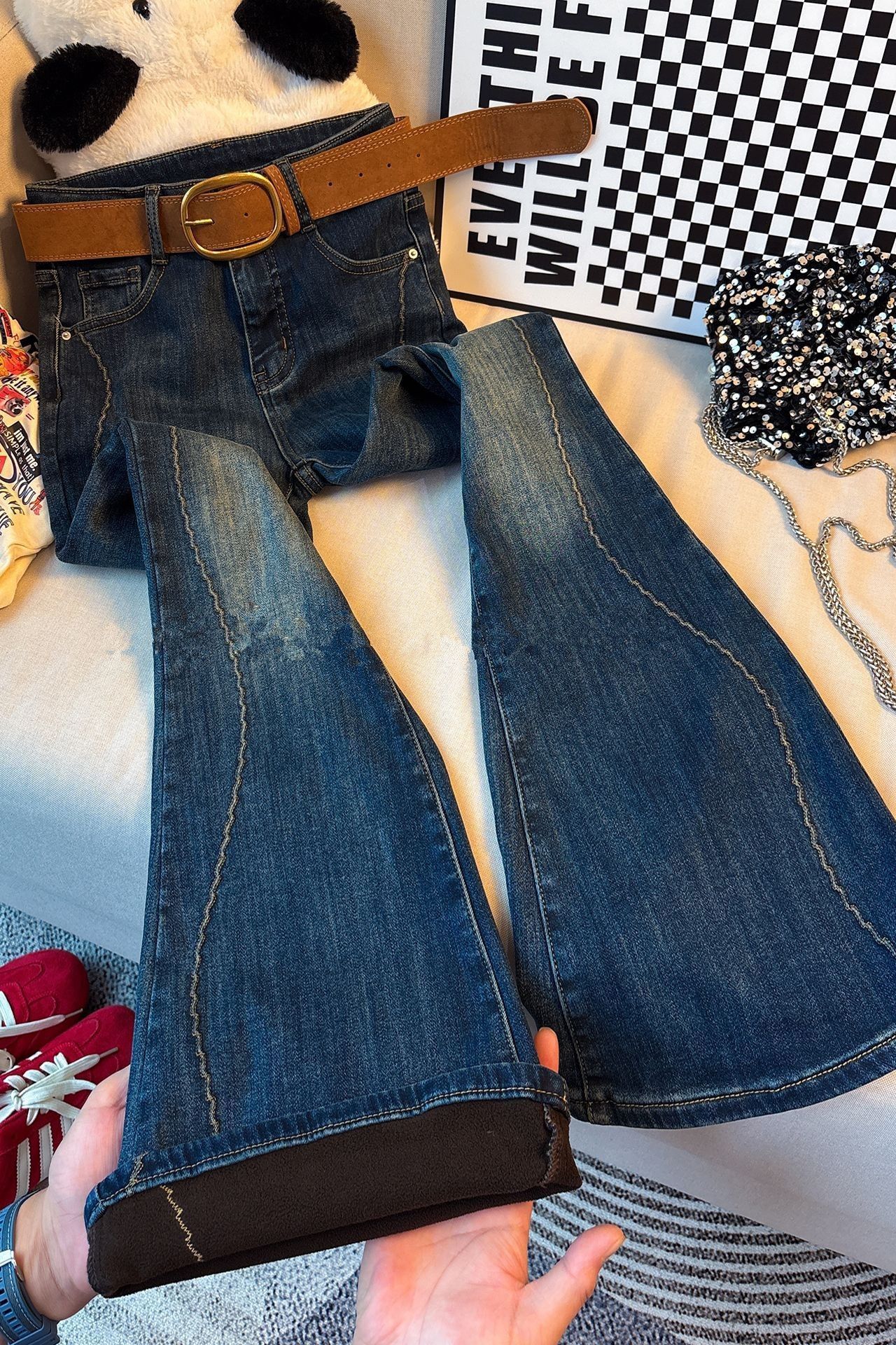设计感复古高腰微喇牛仔裤女秋冬加绒加厚小众修身显瘦喇叭马蹄裤