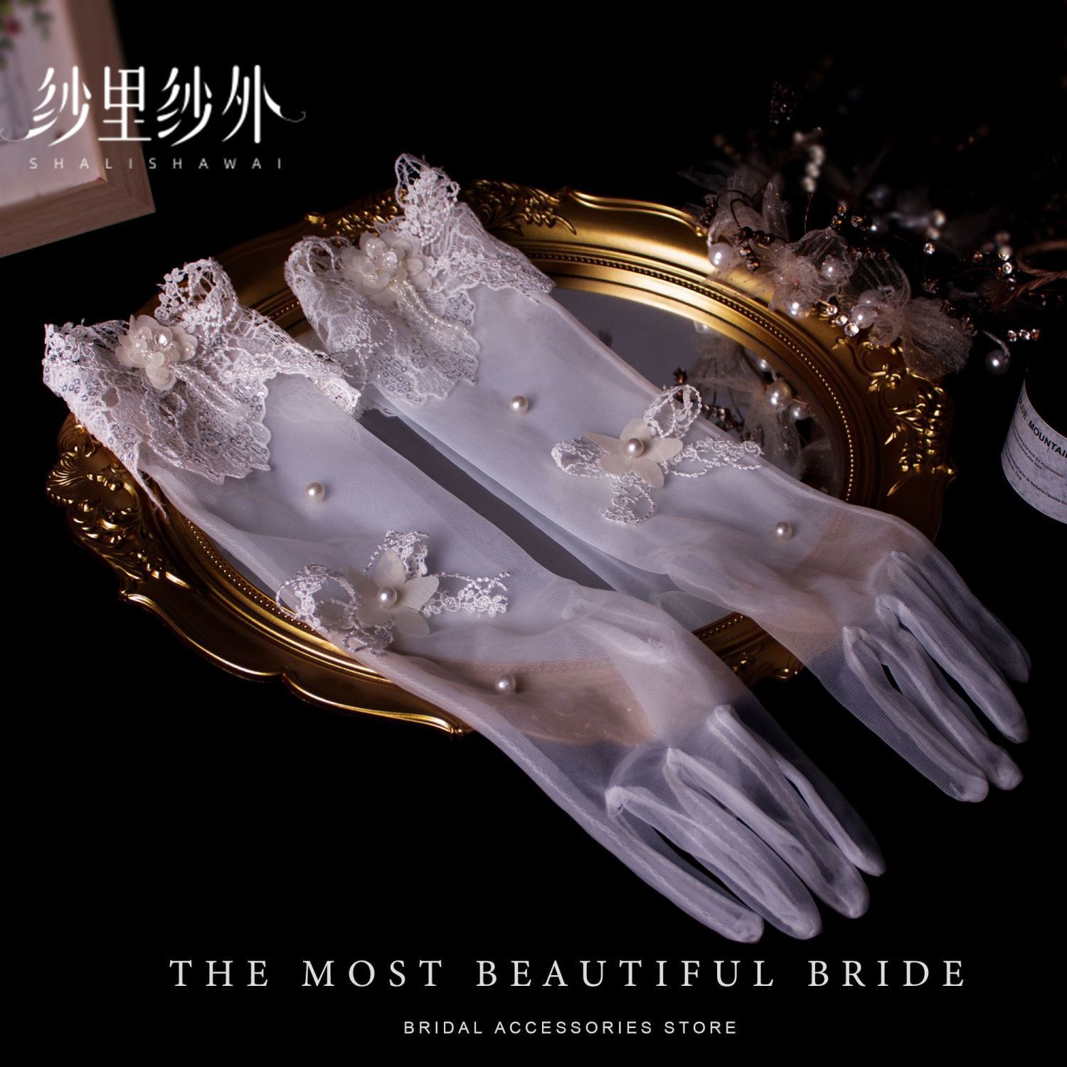新款新娘婚纱手套复古蕾丝白色网纱蝴蝶结珍珠结婚礼服领证手套