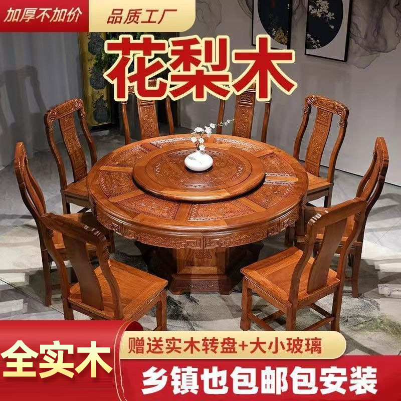 全实木花梨木餐桌椅组合中式家用带转盘红木餐桌仿古雕花大圆桌子