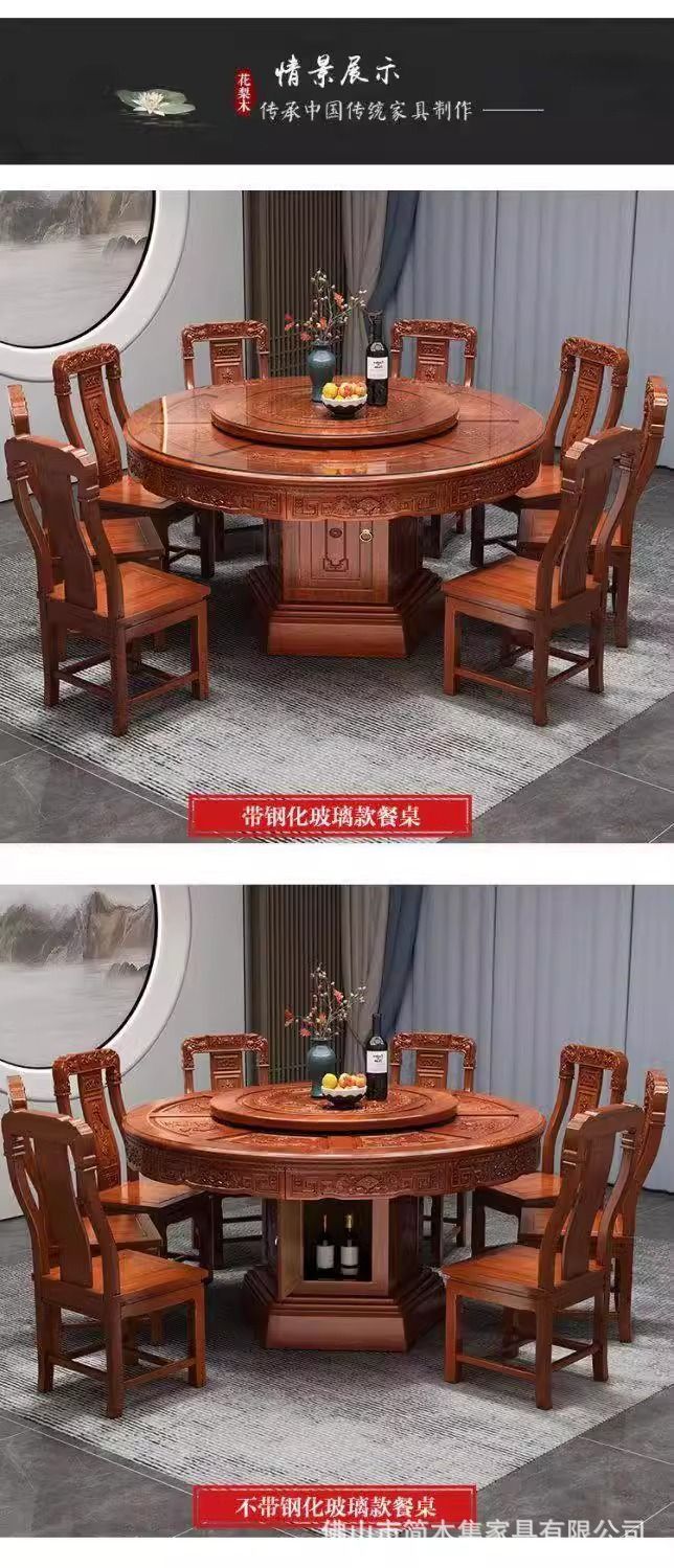 花梨木实木餐桌椅餐桌组合家用圆形转盘饭桌红木仿古中式雕花圆桌