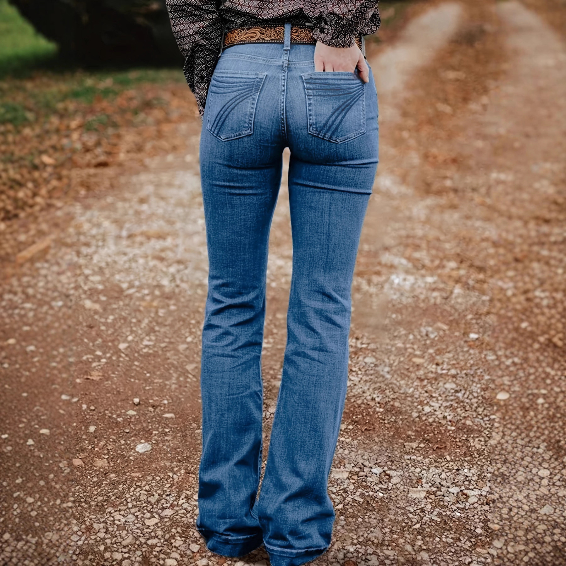 欧美跨境女式弹力牛仔裤刺绣微喇叭修身长裤蓝色灰色WOMEN JEANS