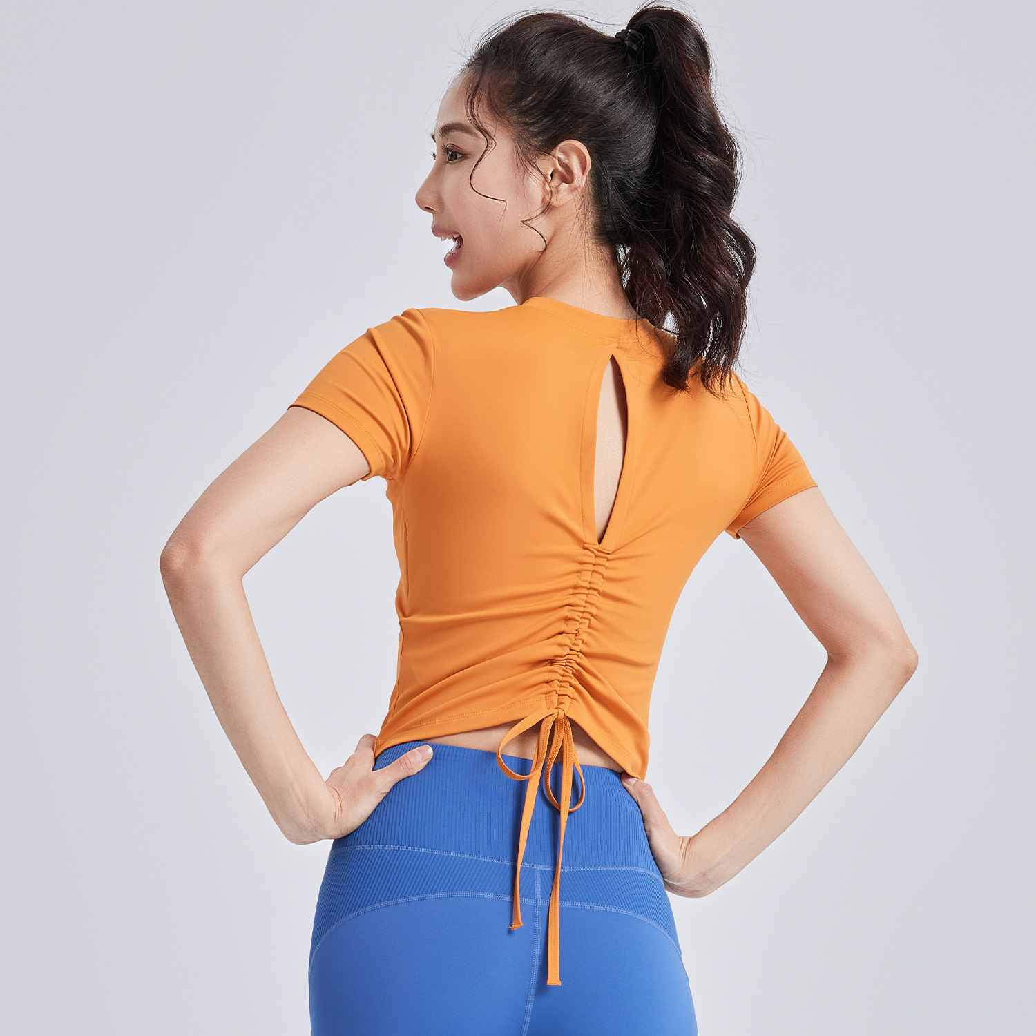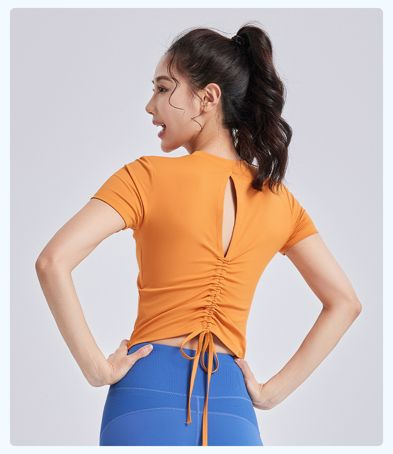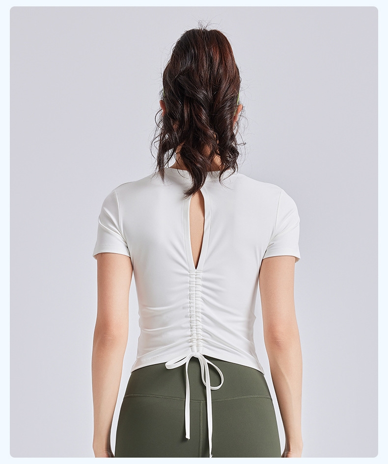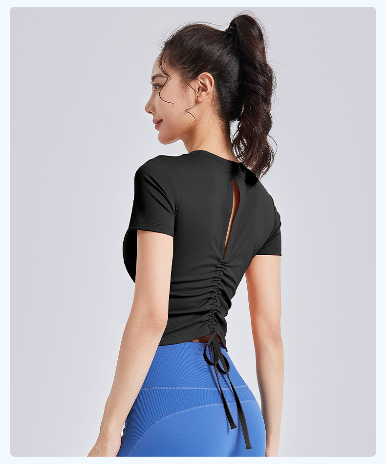 新款镂空美背瑜伽服短袖女时尚抽绳褶皱带胸垫一体式健身运动t恤