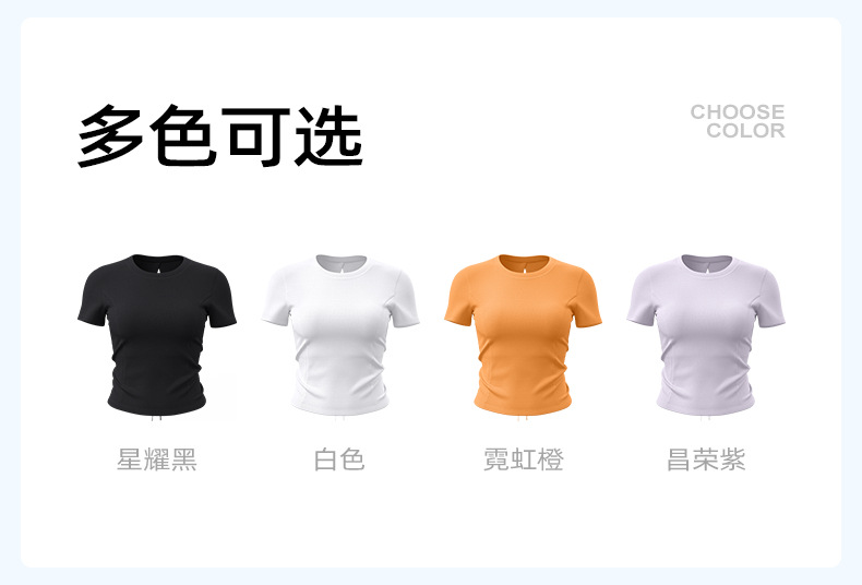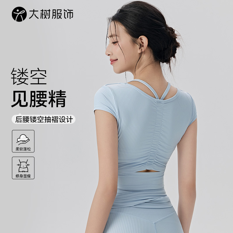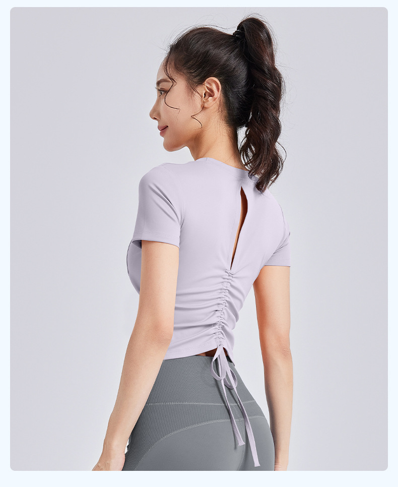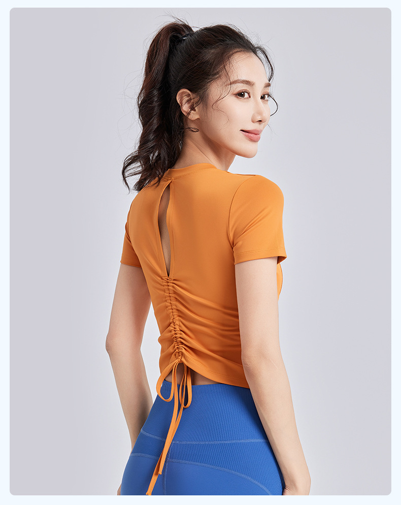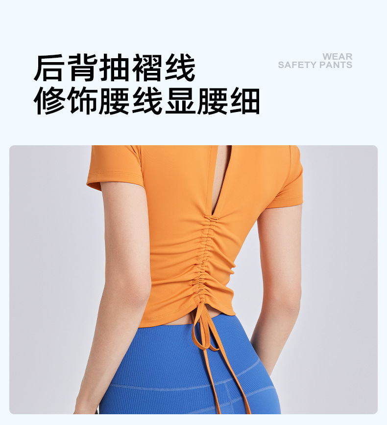 新款镂空美背瑜伽服短袖女时尚抽绳褶皱带胸垫一体式健身运动t恤
