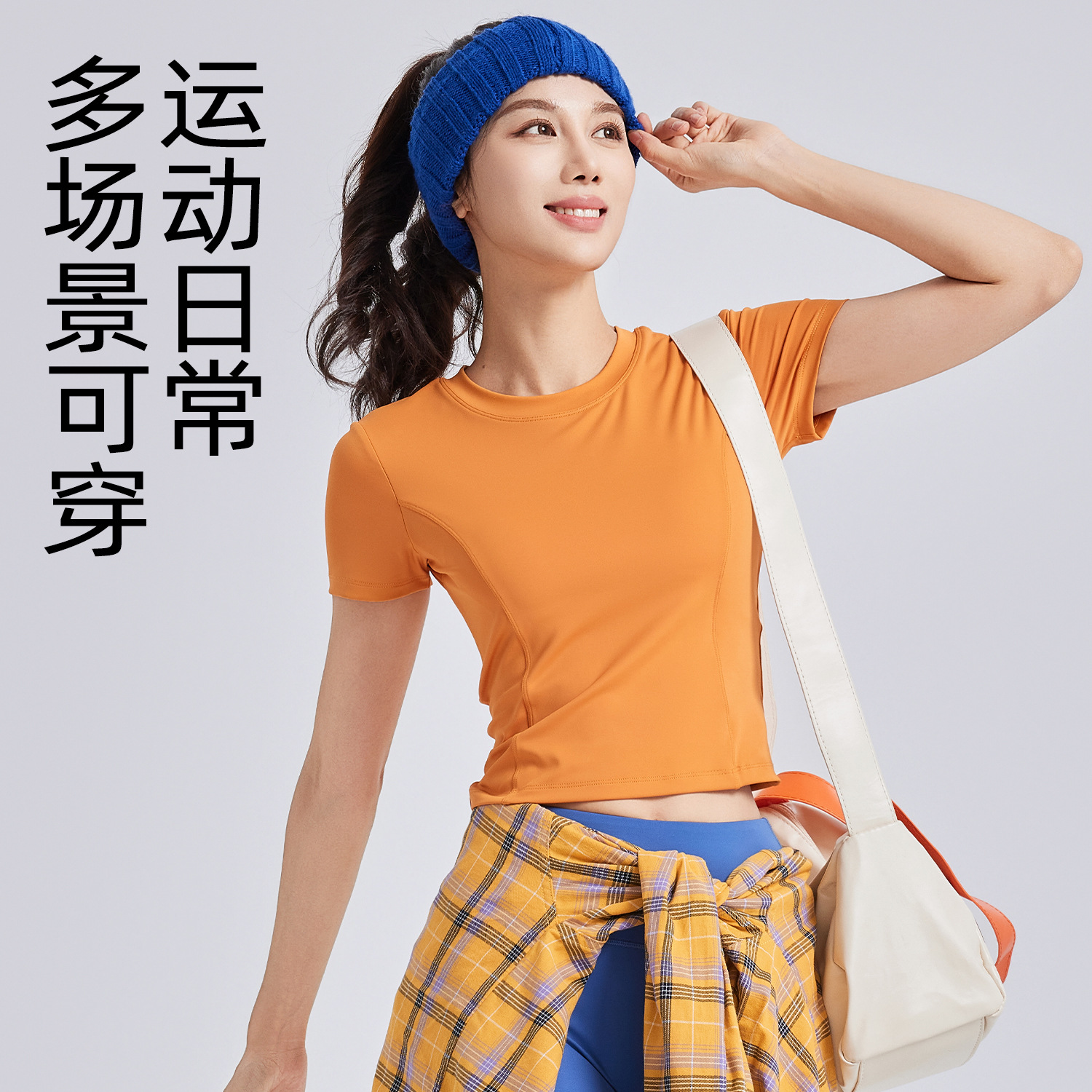 新しいクロス半袖スポーツトップス、胸パッド一体型フィットネスヨガウェア、ヌードへそ出しショートタイツ