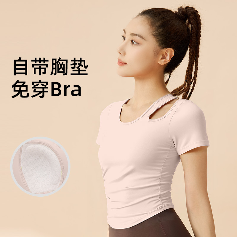 新商品のしわ取りヨガ服女性ベルト一体式胸パッド春夏斜め肩抜き運動半袖プラティ上着