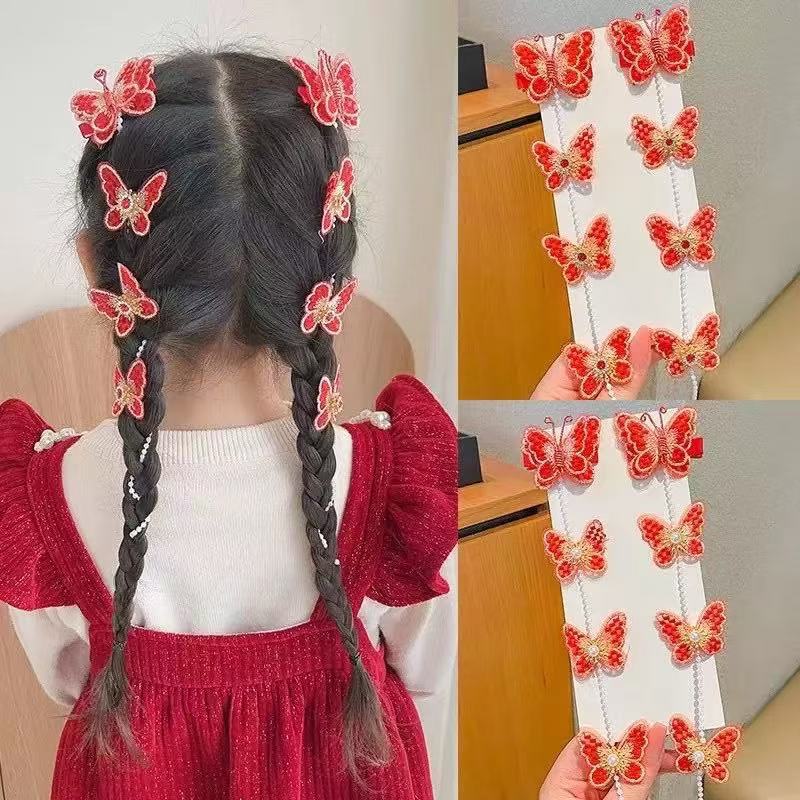 新年のヘアアクセサリー、子供用蝶のヘアピン、タッセル付き中国風編み込みヘアチェーン、ベビー用両開きピン、女の子用お祝いヘアピン