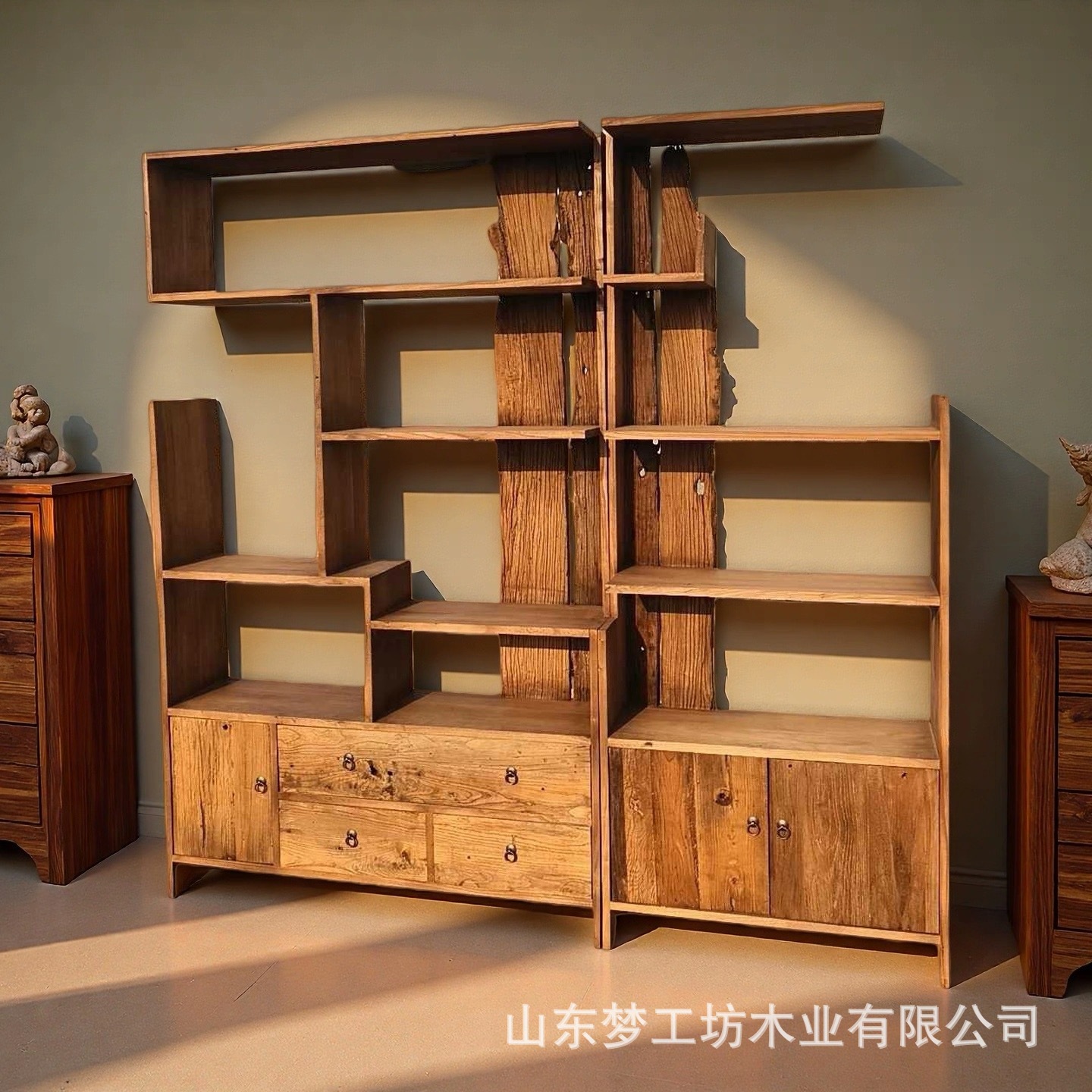 复古老榆木博古架侘寂风榆木实木展示架新中式家用多功能书架