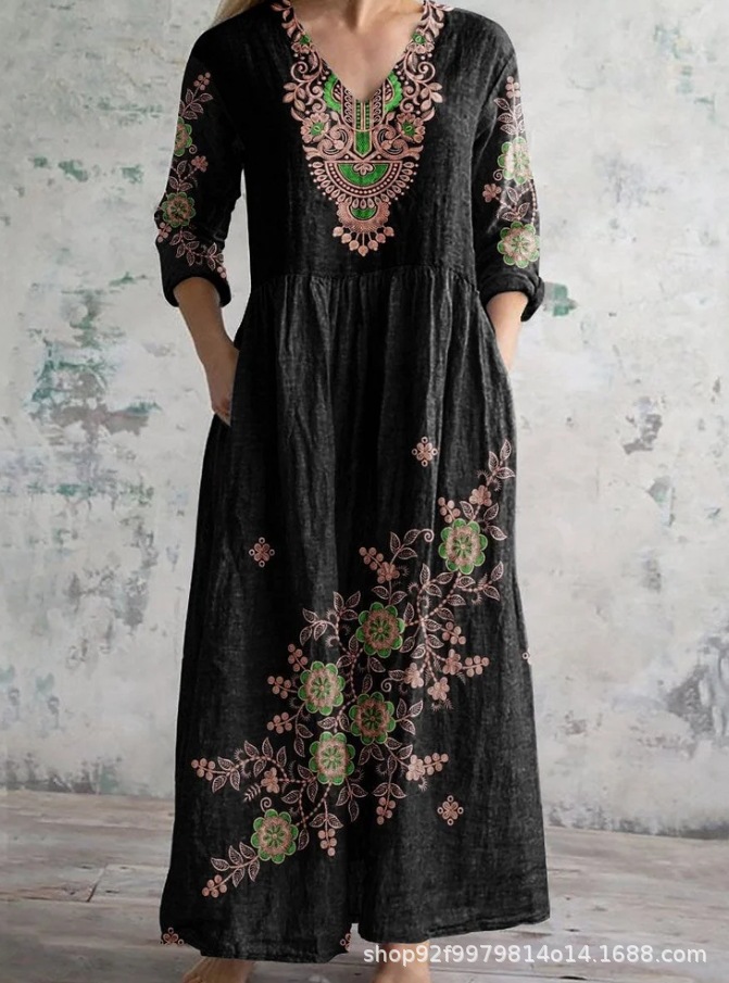 CP14865A38 クロスボーダーレディースドレスカジュアルデジタルプリント柄Vネックプルオーバー半袖ウエストドレス