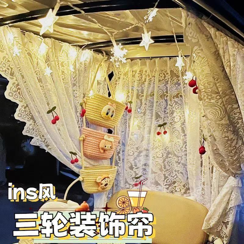 三轮电动车窗帘遮阳帘公主风防晒帘魔术贴纱帘电动三轮车内饰改造